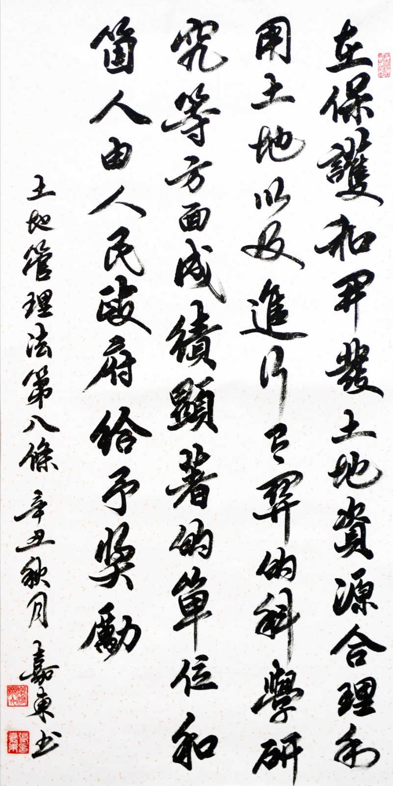 繼1600余位書法家參與書寫《中華人民共和國民法典》全部1260條法條之后,法治日報社聯(lián)合自然資源部法規(guī)司、自然資源部書畫研究會和北京昌平書法家協(xié)會,將筆端對準土地管理“一法一條例”,即《中華人民共和國土地管理法》和《中華人民共和國土地管理法實施條例》。