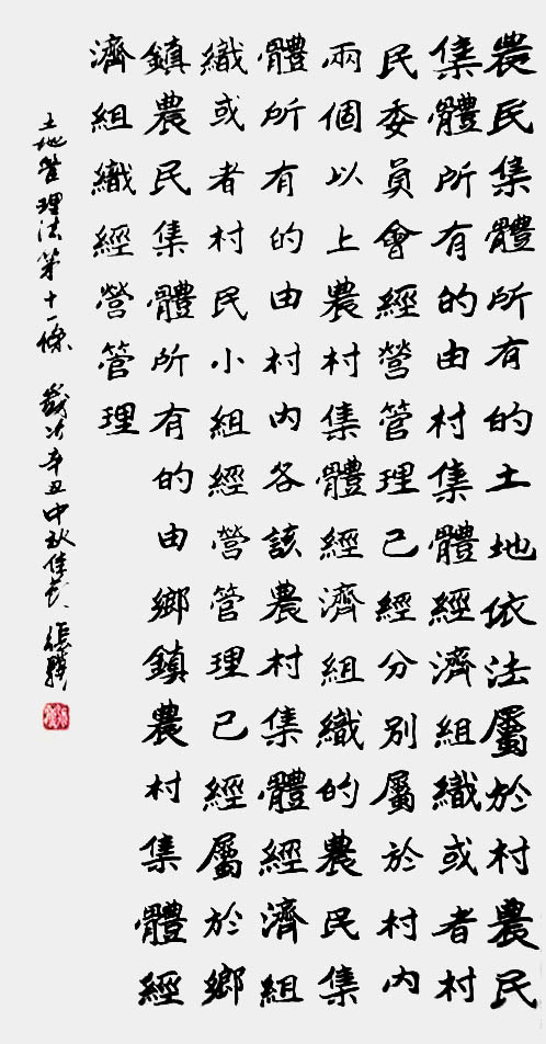 繼1600余位書(shū)法家參與書(shū)寫(xiě)《中華人民共和國(guó)民法典》全部1260條法條之后,法治日?qǐng)?bào)社聯(lián)合自然資源部法規(guī)司、自然資源部書(shū)畫(huà)研究會(huì)和北京昌平書(shū)法家協(xié)會(huì),將筆端對(duì)準(zhǔn)土地管理“一法一條例”,即《中華人民共和國(guó)土地管理法》和《中華人民共和國(guó)土地管理法實(shí)施條例》。
