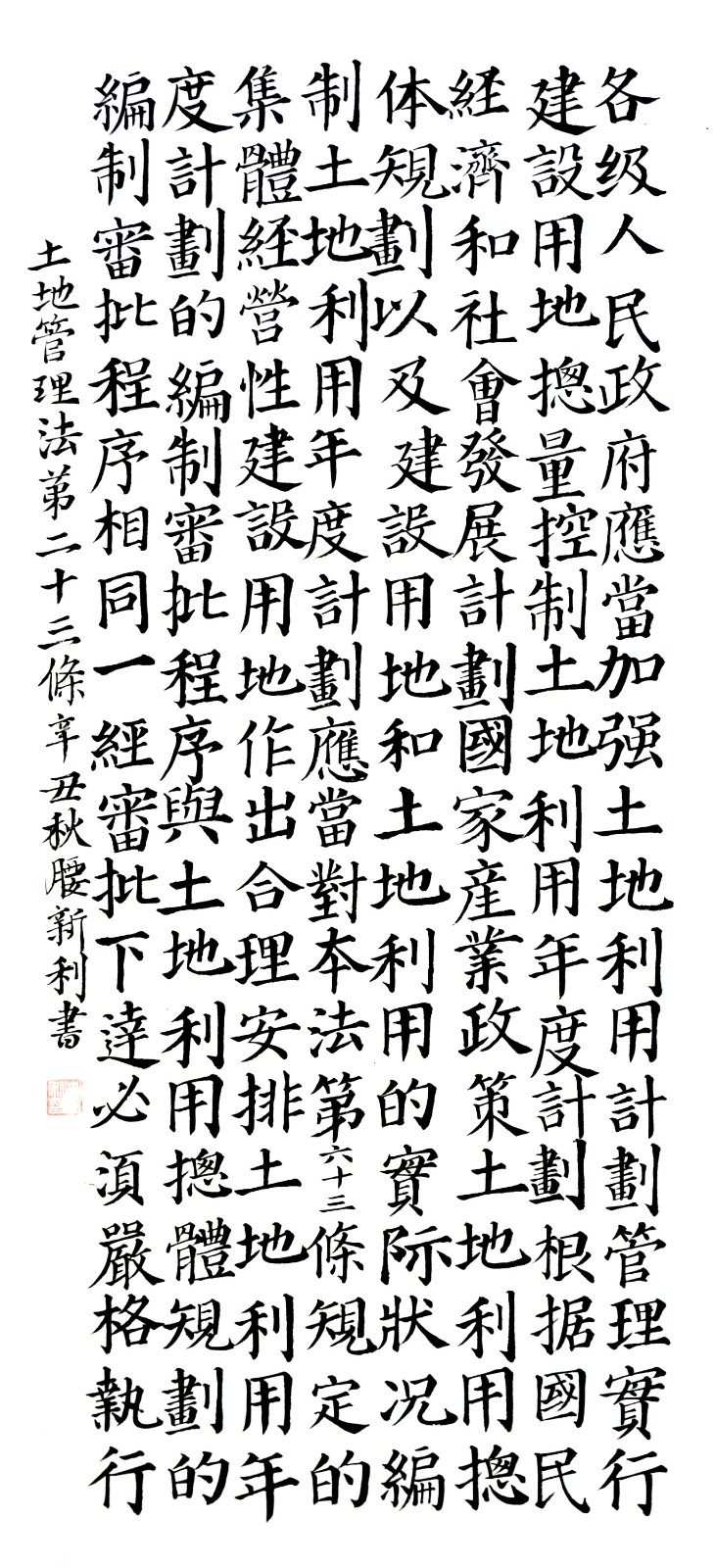 繼1600余位書法家參與書寫《中華人民共和國(guó)民法典》全部1260條法條之后,法治日?qǐng)?bào)社聯(lián)合自然資源部法規(guī)司、自然資源部書畫研究會(huì)和北京昌平書法家協(xié)會(huì),將筆端對(duì)準(zhǔn)土地管理“一法一條例”,即《中華人民共和國(guó)土地管理法》和《中華人民共和國(guó)土地管理法實(shí)施條例》。