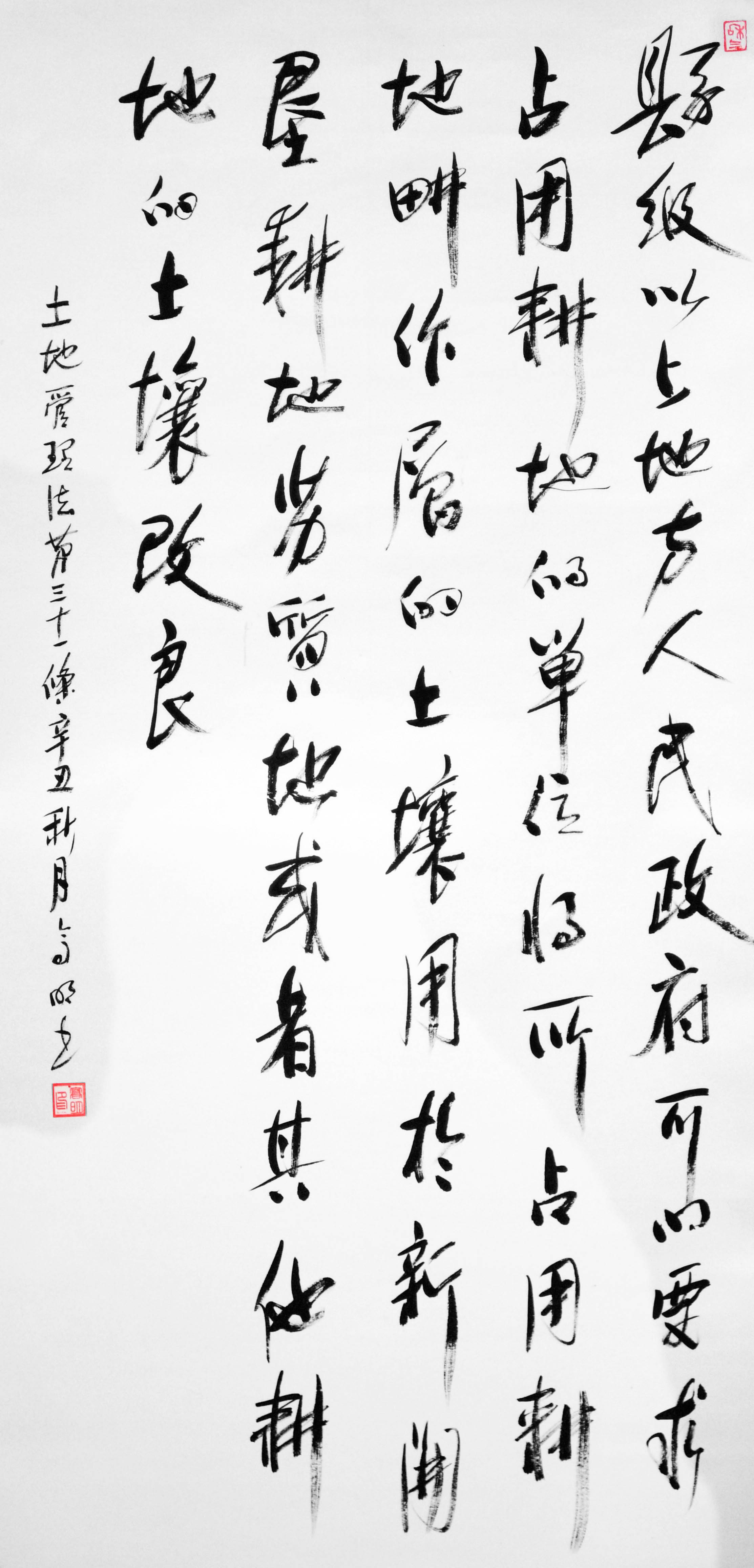 繼1600余位書法家參與書寫《中華人民共和國(guó)民法典》全部1260條法條之后,法治日?qǐng)?bào)社聯(lián)合自然資源部法規(guī)司、自然資源部書畫研究會(huì)和北京昌平書法家協(xié)會(huì),將筆端對(duì)準(zhǔn)土地管理“一法一條例”,即《中華人民共和國(guó)土地管理法》和《中華人民共和國(guó)土地管理法實(shí)施條例》。