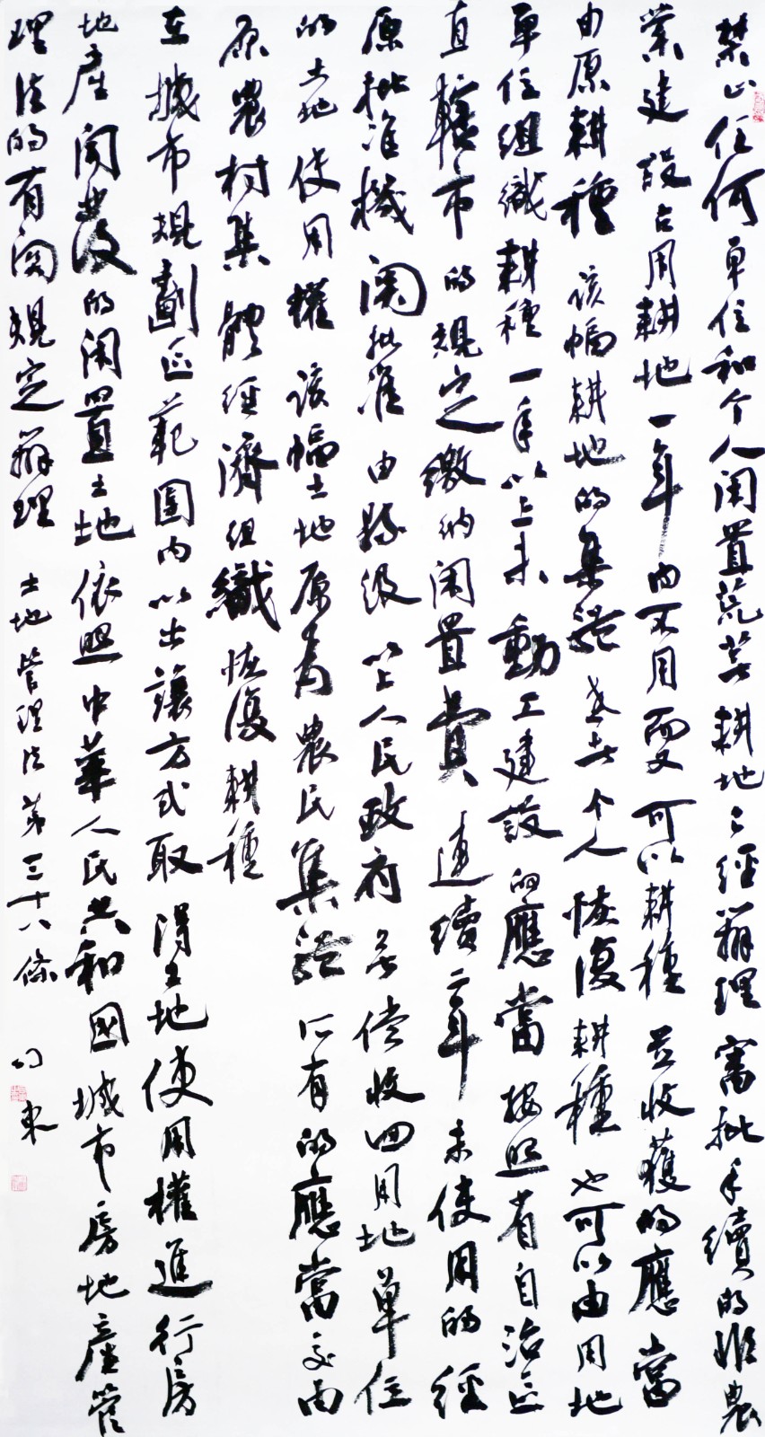 繼1600余位書法家參與書寫《中華人民共和國民法典》全部1260條法條之后,法治日報社聯(lián)合自然資源部法規(guī)司、自然資源部書畫研究會和北京昌平書法家協(xié)會,將筆端對準土地管理“一法一條例”,即《中華人民共和國土地管理法》和《中華人民共和國土地管理法實施條例》。