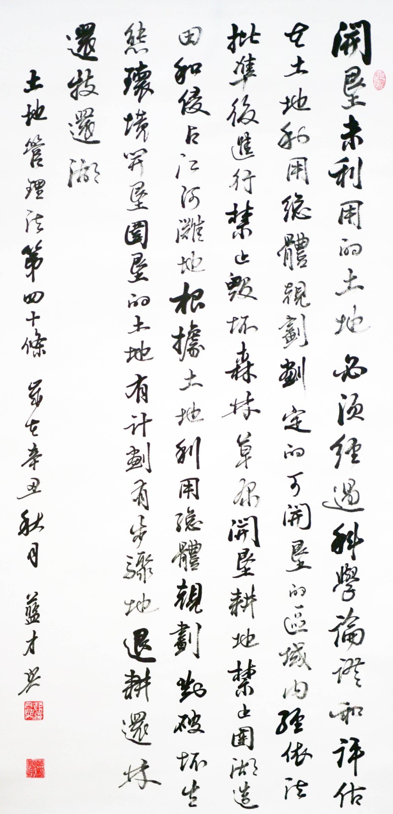繼1600余位書法家參與書寫《中華人民共和國民法典》全部1260條法條之后,法治日報社聯(lián)合自然資源部法規(guī)司、自然資源部書畫研究會和北京昌平書法家協(xié)會,將筆端對準土地管理“一法一條例”,即《中華人民共和國土地管理法》和《中華人民共和國土地管理法實施條例》。