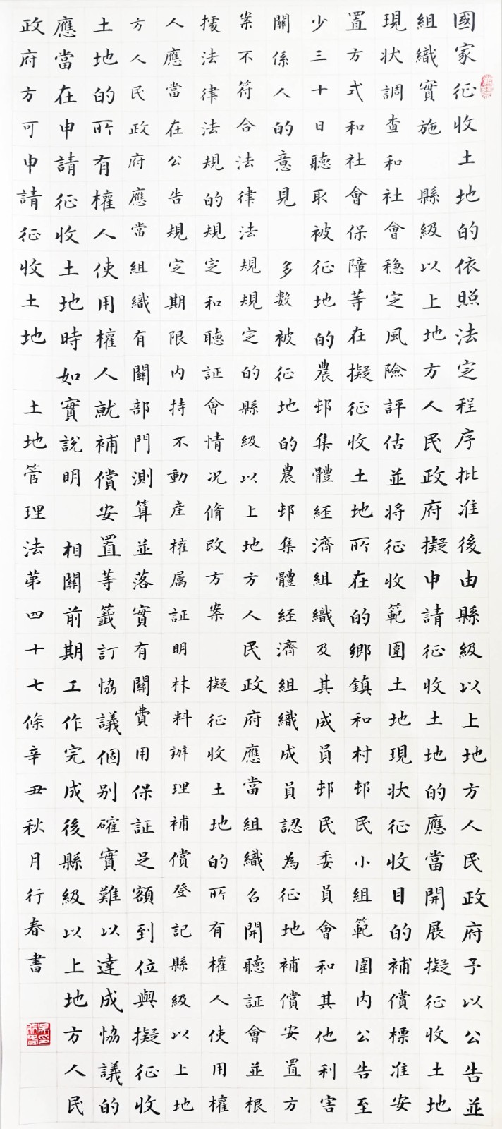 繼1600余位書法家參與書寫《中華人民共和國民法典》全部1260條法條之后,法治日報社聯(lián)合自然資源部法規(guī)司、自然資源部書畫研究會和北京昌平書法家協(xié)會,將筆端對準(zhǔn)土地管理“一法一條例”,即《中華人民共和國土地管理法》和《中華人民共和國土地管理法實施條例》。