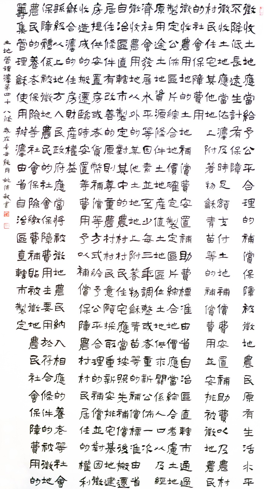 繼1600余位書法家參與書寫《中華人民共和國民法典》全部1260條法條之后,法治日?qǐng)?bào)社聯(lián)合自然資源部法規(guī)司、自然資源部書畫研究會(huì)和北京昌平書法家協(xié)會(huì),將筆端對(duì)準(zhǔn)土地管理“一法一條例”,即《中華人民共和國土地管理法》和《中華人民共和國土地管理法實(shí)施條例》。