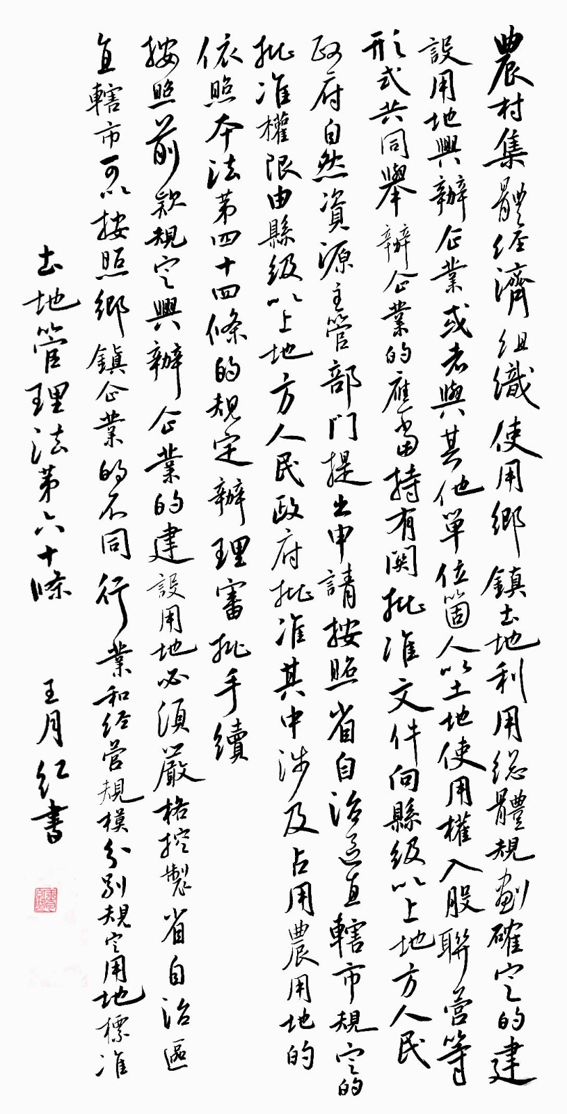 繼1600余位書法家參與書寫《中華人民共和國民法典》全部1260條法條之后,法治日報(bào)社聯(lián)合自然資源部法規(guī)司、自然資源部書畫研究會和北京昌平書法家協(xié)會,將筆端對準(zhǔn)土地管理“一法一條例”,即《中華人民共和國土地管理法》和《中華人民共和國土地管理法實(shí)施條例》。