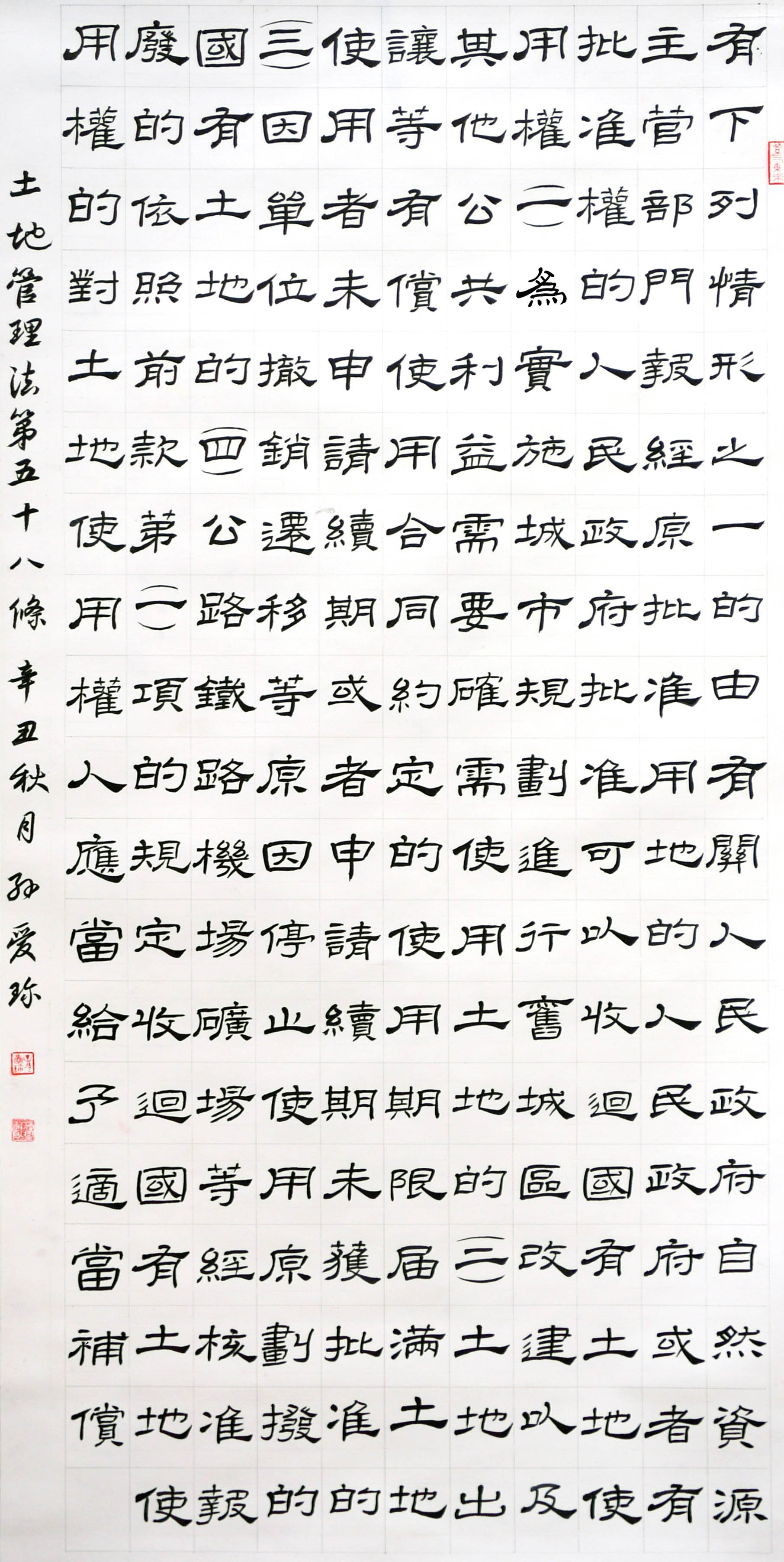 繼1600余位書法家參與書寫《中華人民共和國民法典》全部1260條法條之后,法治日報(bào)社聯(lián)合自然資源部法規(guī)司、自然資源部書畫研究會和北京昌平書法家協(xié)會,將筆端對準(zhǔn)土地管理“一法一條例”,即《中華人民共和國土地管理法》和《中華人民共和國土地管理法實(shí)施條例》。