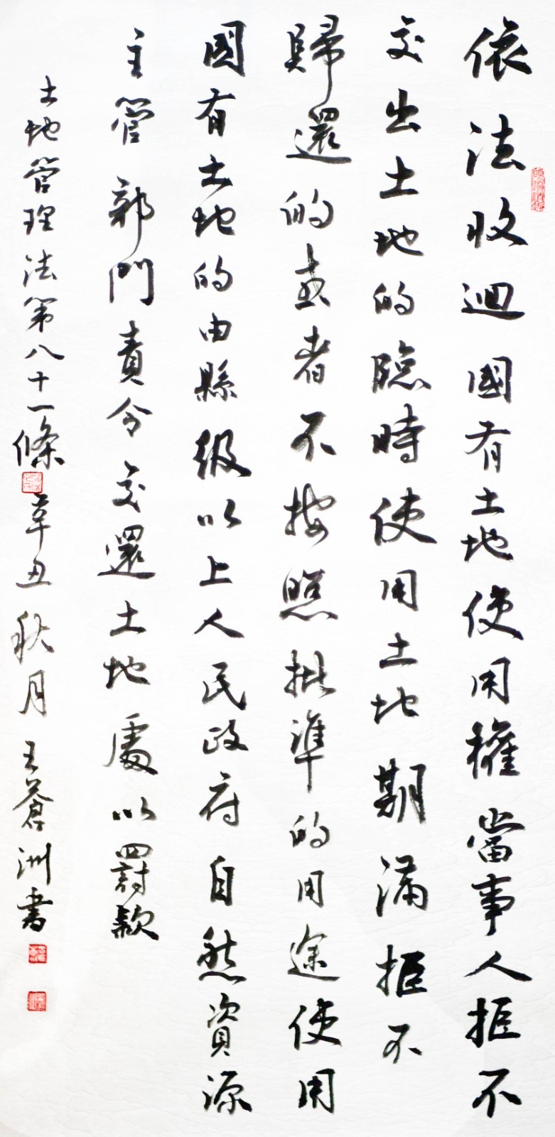 繼1600余位書法家參與書寫《中華人民共和國民法典》全部1260條法條之后,法治日報社聯(lián)合自然資源部法規(guī)司、自然資源部書畫研究會和北京昌平書法家協(xié)會,將筆端對準土地管理“一法一條例”,即《中華人民共和國土地管理法》和《中華人民共和國土地管理法實施條例》。