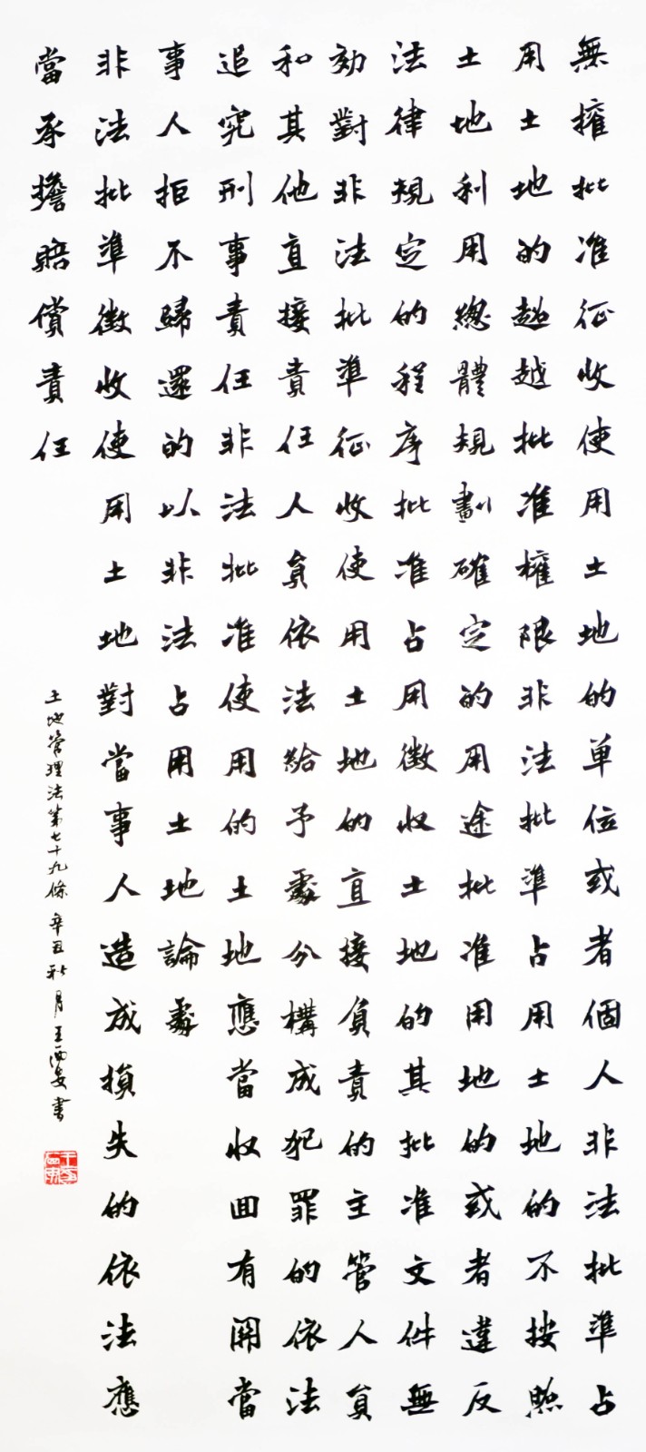 繼1600余位書法家參與書寫《中華人民共和國民法典》全部1260條法條之后,法治日?qǐng)?bào)社聯(lián)合自然資源部法規(guī)司、自然資源部書畫研究會(huì)和北京昌平書法家協(xié)會(huì),將筆端對(duì)準(zhǔn)土地管理“一法一條例”,即《中華人民共和國土地管理法》和《中華人民共和國土地管理法實(shí)施條例》。