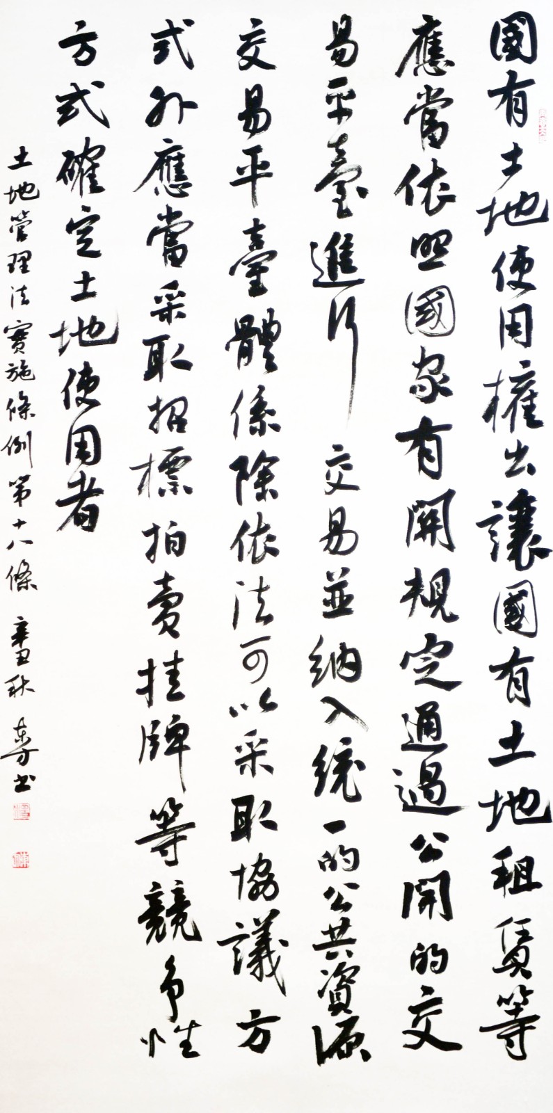 繼1600余位書(shū)法家參與書(shū)寫(xiě)《中華人民共和國(guó)民法典》全部1260條法條之后,法治日?qǐng)?bào)社聯(lián)合自然資源部法規(guī)司、自然資源部書(shū)畫(huà)研究會(huì)和北京昌平書(shū)法家協(xié)會(huì),將筆端對(duì)準(zhǔn)土地管理“一法一條例”,即《中華人民共和國(guó)土地管理法》和《中華人民共和國(guó)土地管理法實(shí)施條例》。