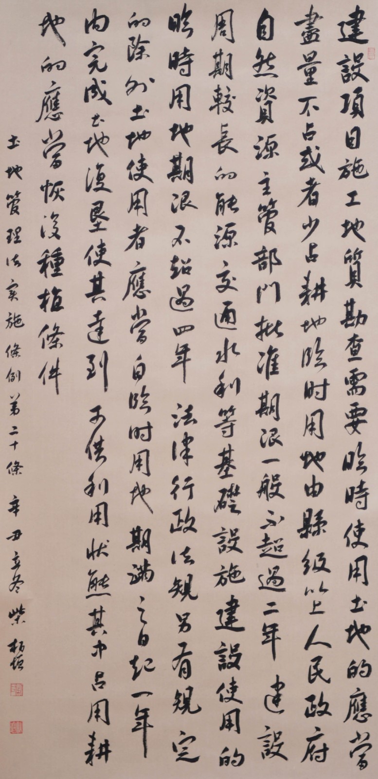 繼1600余位書法家參與書寫《中華人民共和國民法典》全部1260條法條之后,法治日報社聯(lián)合自然資源部法規(guī)司、自然資源部書畫研究會和北京昌平書法家協(xié)會,將筆端對準(zhǔn)土地管理“一法一條例”,即《中華人民共和國土地管理法》和《中華人民共和國土地管理法實(shí)施條例》。