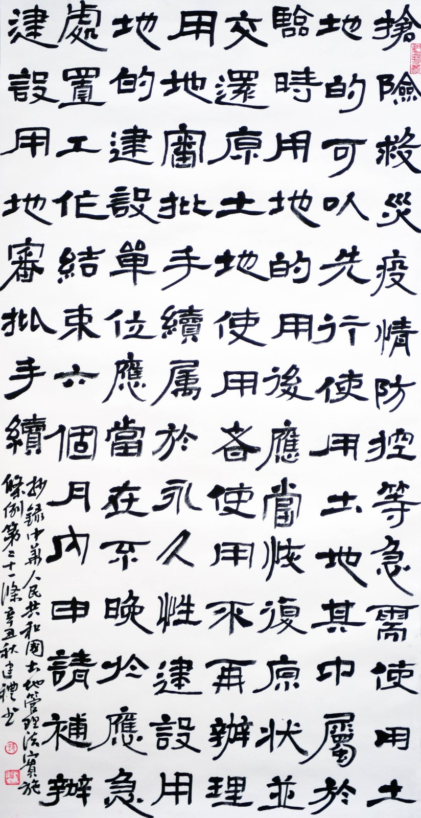 繼1600余位書法家參與書寫《中華人民共和國民法典》全部1260條法條之后,法治日報社聯(lián)合自然資源部法規(guī)司、自然資源部書畫研究會和北京昌平書法家協(xié)會,將筆端對準(zhǔn)土地管理“一法一條例”,即《中華人民共和國土地管理法》和《中華人民共和國土地管理法實施條例》。