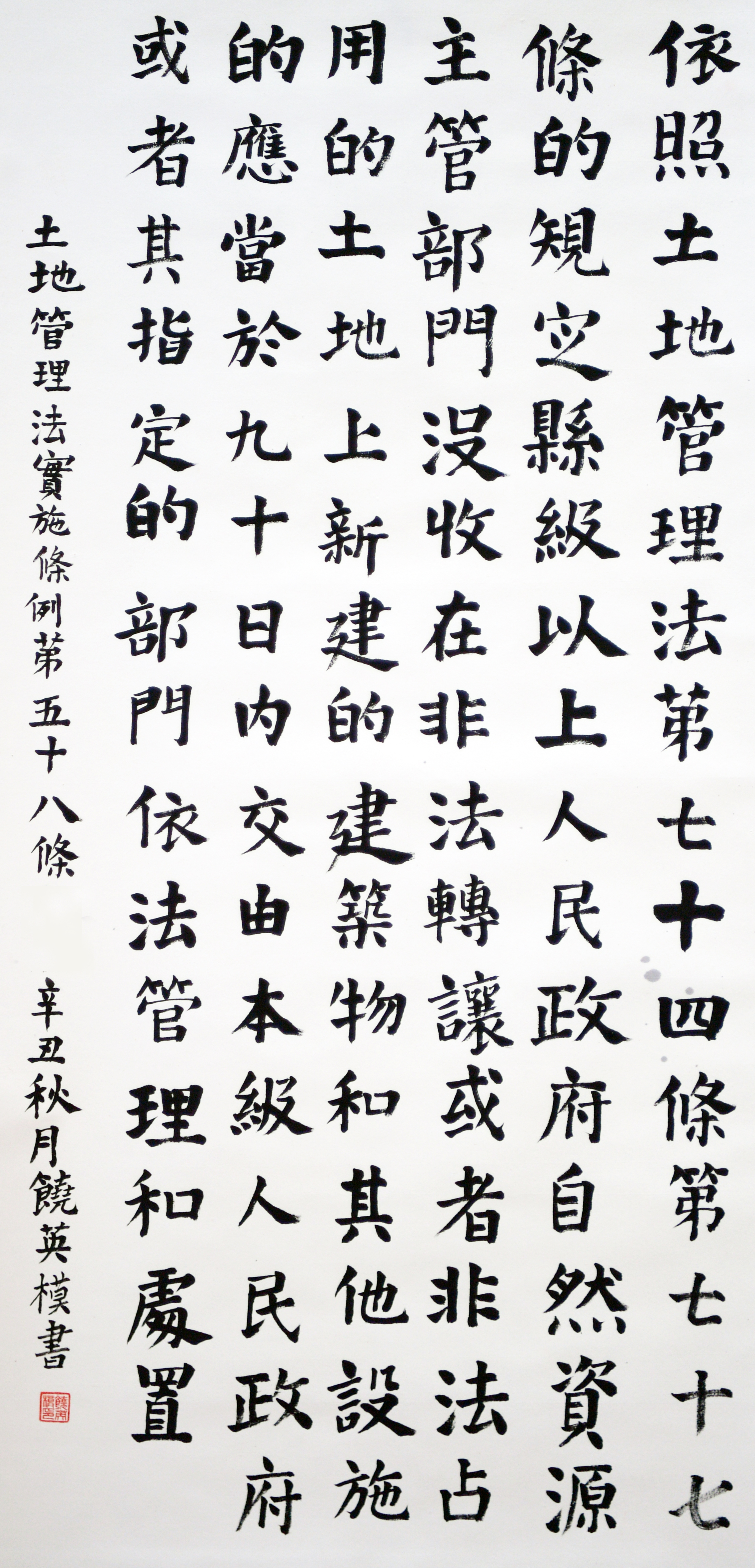 繼1600余位書法家參與書寫《中華人民共和國民法典》全部1260條法條之后,法治日報社聯(lián)合自然資源部法規(guī)司、自然資源部書畫研究會和北京昌平書法家協(xié)會,將筆端對準土地管理“一法一條例”,即《中華人民共和國土地管理法》和《中華人民共和國土地管理法實施條例》。