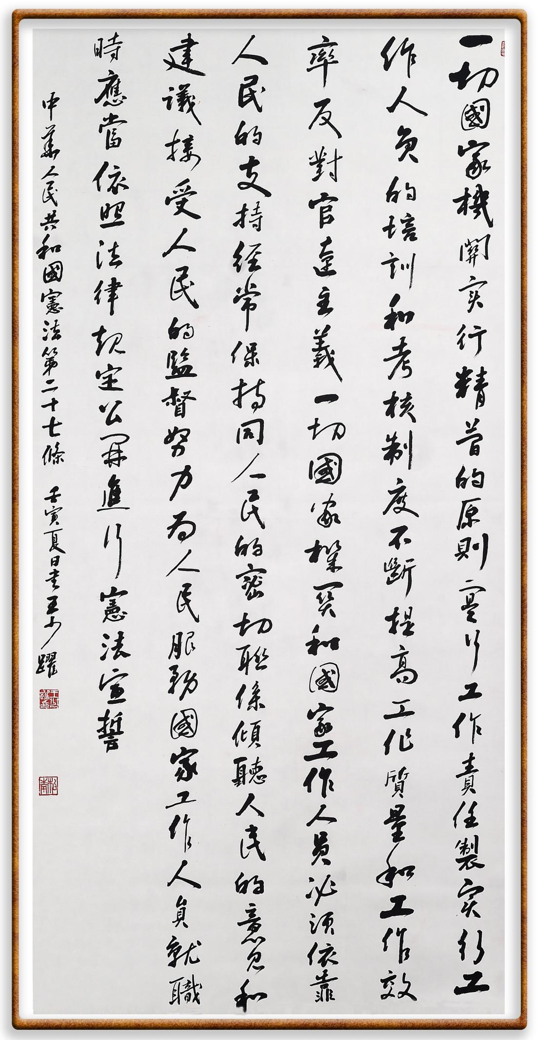 繼《中華人民共和國(guó)民法典》《中華人民共和國(guó)土地管理法》《中華人民共和國(guó)土地管理法實(shí)施條例》《中華人民共和國(guó)法律援助法》之后,法治日?qǐng)?bào)社聯(lián)合北京市司法局、北京市書(shū)法家協(xié)會(huì),將筆端對(duì)準(zhǔn)《中華人民共和國(guó)憲法》和《中華人民共和國(guó)行政處罰法》。