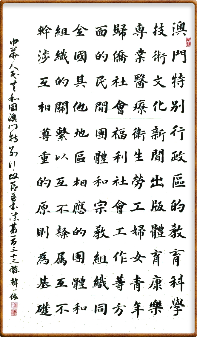 澳門基本法第一百三十三條 澳門特別行政區(qū)的教育、科學(xué)、技術(shù)、文化、新聞、出版、體育、康樂、專業(yè)、醫(yī)療衛(wèi)生、勞工、婦女、青年、歸僑、社會福利、社會工作等方面的民間團體和宗教組織同全國其他地區(qū)相應(yīng)的團體和組織的關(guān)系,以互不隸屬、互不干涉、互相尊重的原則為基礎(chǔ)。