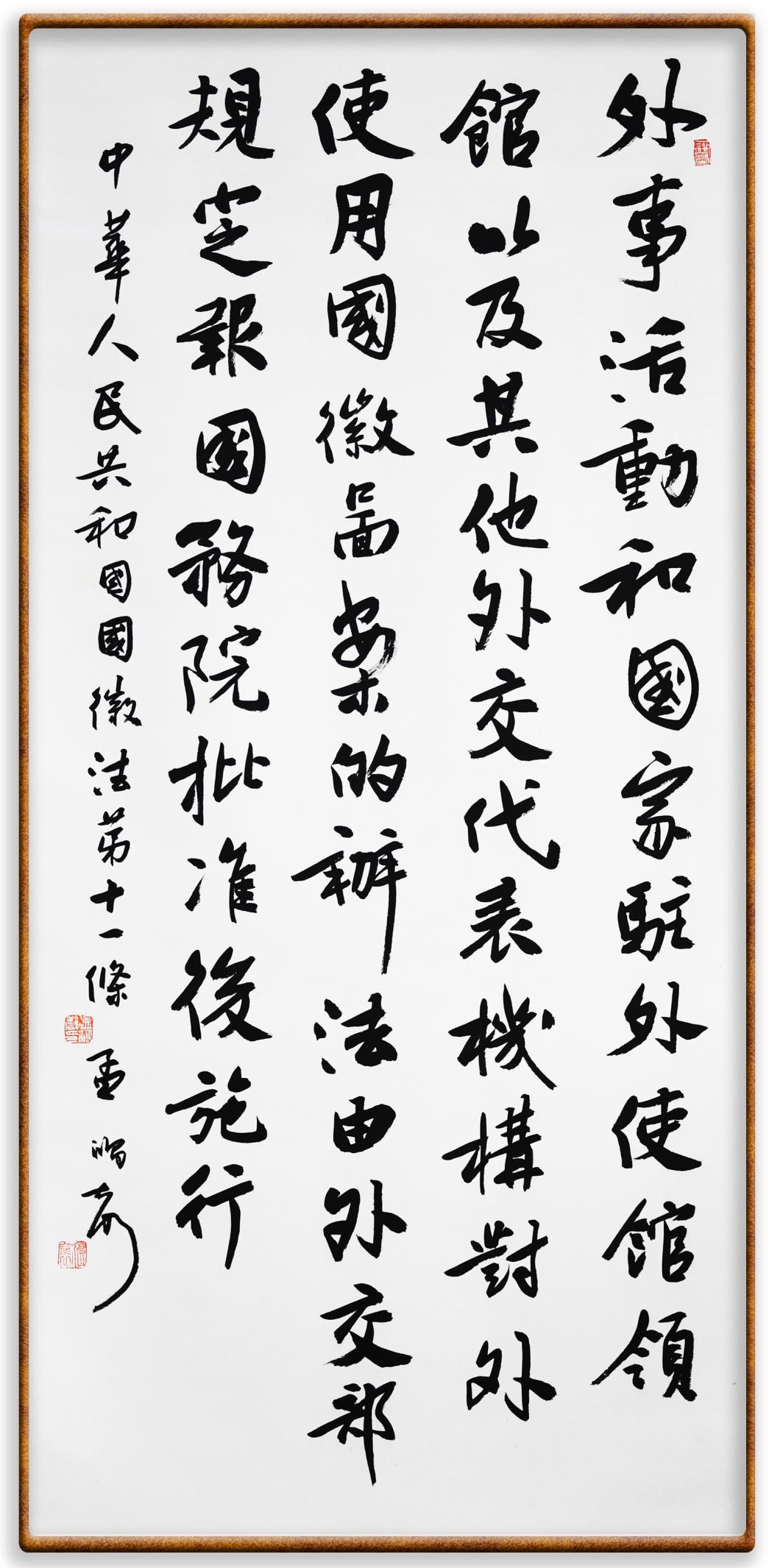 國徽法第十一條 外事活動和國家駐外使館、領館以及其他外交代表機構對外使用國徽圖案的辦法,由外交部規(guī)定,報國務院批準后施行。