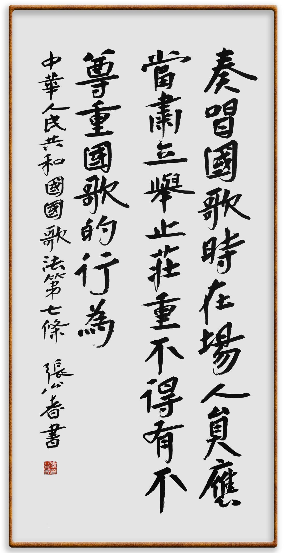 國歌法第七條 奏唱國歌時(shí),在場人員應(yīng)當(dāng)肅立,舉止莊重,不得有不尊重國歌的行為。