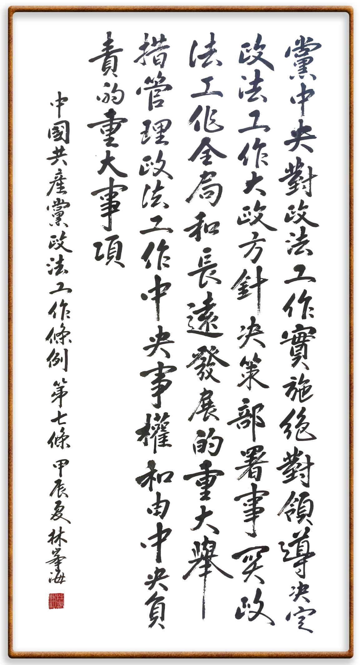 《中國共產(chǎn)黨政法工作條例》對黨領導新時代政法工作進行全面制度擘畫,為黨領導政法工作提供基本遵循,具有重大而深遠的意義。為學習好、宣傳好、貫徹好、實施好這部黨內(nèi)法規(guī),繼《中華人民共和國民法典》《中華人民共和國憲法》《信訪工作條例》《中華人民共和國澳門特別行政區(qū)基本法》《中華人民共和國香港特別行政區(qū)基本法》等法律法規(guī)之后,“書·法”系列活動將筆端對準《中國共產(chǎn)黨政法工作條例》。