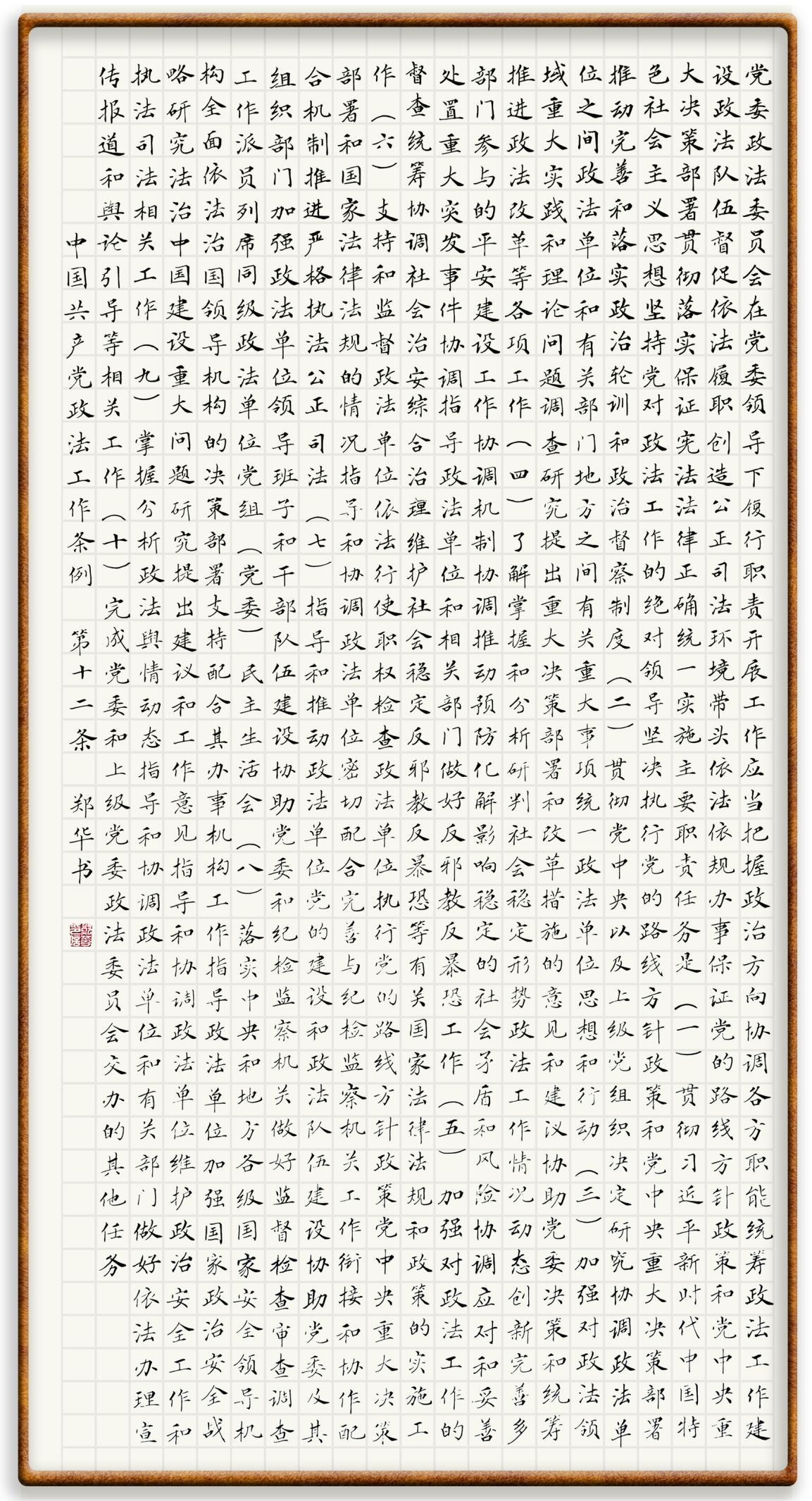 《中國共產黨政法工作條例》對黨領導新時代政法工作進行全面制度擘畫,為黨領導政法工作提供基本遵循,具有重大而深遠的意義。為學習好、宣傳好、貫徹好、實施好這部黨內法規(guī),繼《中華人民共和國民法典》《中華人民共和國憲法》《信訪工作條例》《中華人民共和國澳門特別行政區(qū)基本法》《中華人民共和國香港特別行政區(qū)基本法》等法律法規(guī)之后,“書·法”系列活動將筆端對準《中國共產黨政法工作條例》。