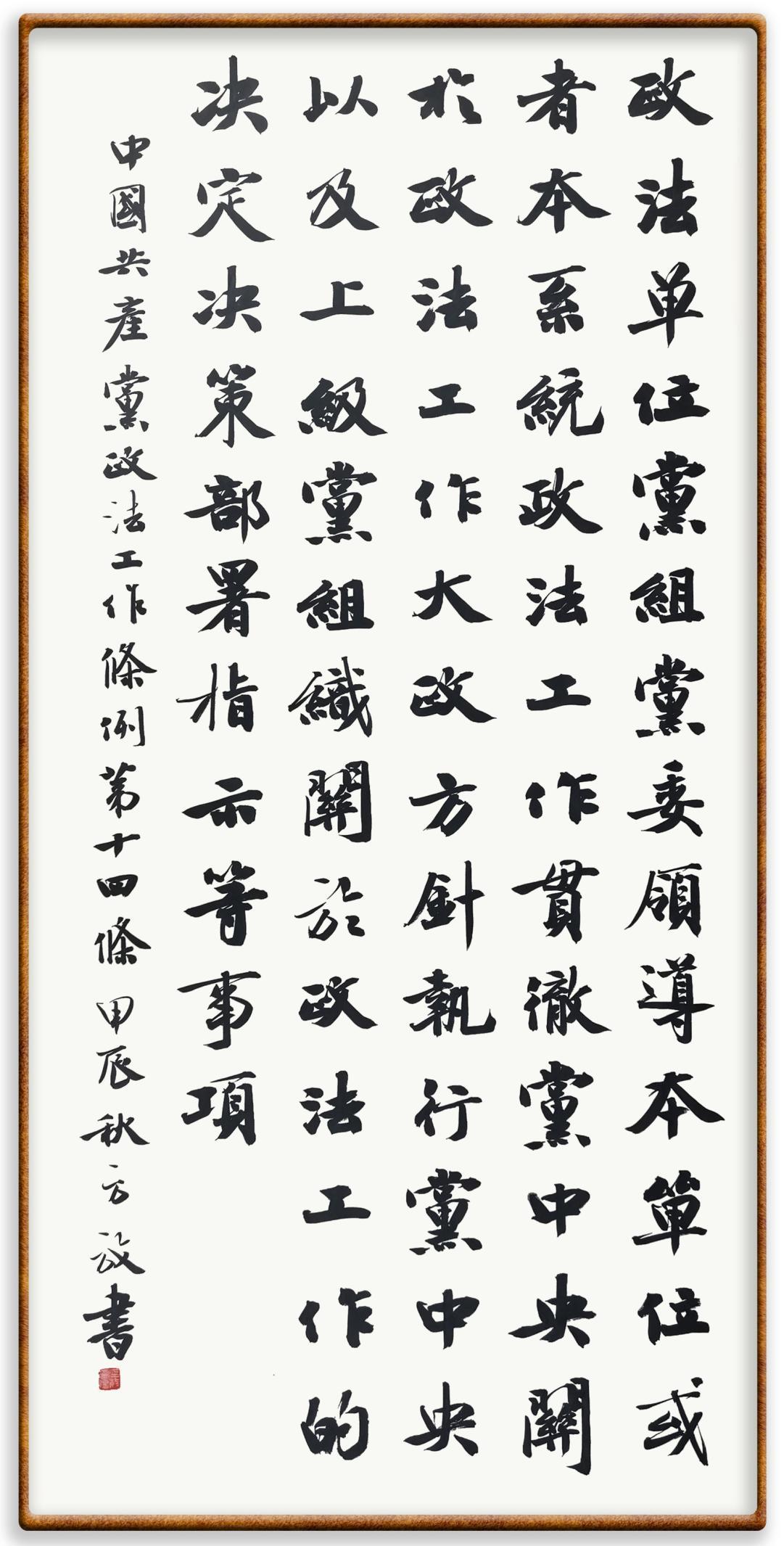 《中國(guó)共產(chǎn)黨政法工作條例》對(duì)黨領(lǐng)導(dǎo)新時(shí)代政法工作進(jìn)行全面制度擘畫(huà),為黨領(lǐng)導(dǎo)政法工作提供基本遵循,具有重大而深遠(yuǎn)的意義。為學(xué)習(xí)好、宣傳好、貫徹好、實(shí)施好這部黨內(nèi)法規(guī),繼《中華人民共和國(guó)民法典》《中華人民共和國(guó)憲法》《信訪工作條例》《中華人民共和國(guó)澳門(mén)特別行政區(qū)基本法》《中華人民共和國(guó)香港特別行政區(qū)基本法》等法律法規(guī)之后,“書(shū)·法”系列活動(dòng)將筆端對(duì)準(zhǔn)《中國(guó)共產(chǎn)黨政法工作條例》。