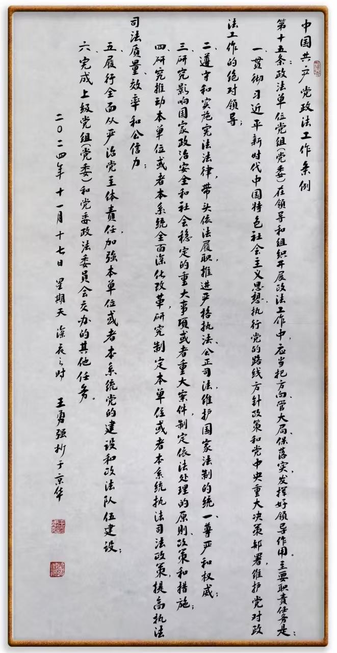 《中國共產(chǎn)黨政法工作條例》對(duì)黨領(lǐng)導(dǎo)新時(shí)代政法工作進(jìn)行全面制度擘畫,為黨領(lǐng)導(dǎo)政法工作提供基本遵循,具有重大而深遠(yuǎn)的意義。為學(xué)習(xí)好、宣傳好、貫徹好、實(shí)施好這部黨內(nèi)法規(guī),繼《中華人民共和國民法典》《中華人民共和國憲法》《信訪工作條例》《中華人民共和國澳門特別行政區(qū)基本法》《中華人民共和國香港特別行政區(qū)基本法》等法律法規(guī)之后,“書·法”系列活動(dòng)將筆端對(duì)準(zhǔn)《中國共產(chǎn)黨政法工作條例》。