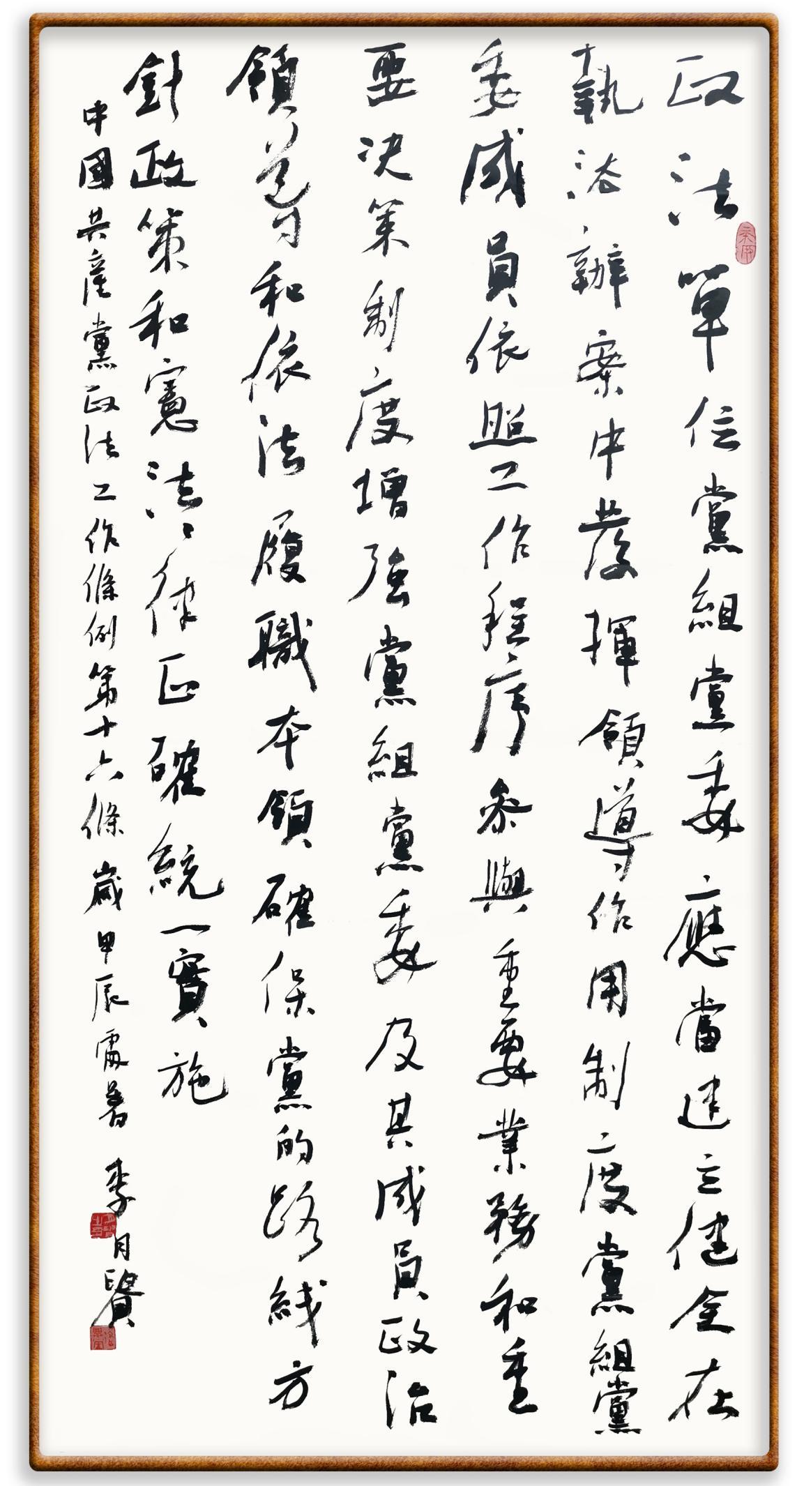 《中國共產(chǎn)黨政法工作條例》對黨領(lǐng)導(dǎo)新時代政法工作進行全面制度擘畫,為黨領(lǐng)導(dǎo)政法工作提供基本遵循,具有重大而深遠的意義。為學(xué)習(xí)好、宣傳好、貫徹好、實施好這部黨內(nèi)法規(guī),繼《中華人民共和國民法典》《中華人民共和國憲法》《信訪工作條例》《中華人民共和國澳門特別行政區(qū)基本法》《中華人民共和國香港特別行政區(qū)基本法》等法律法規(guī)之后,“書·法”系列活動將筆端對準(zhǔn)《中國共產(chǎn)黨政法工作條例》。
