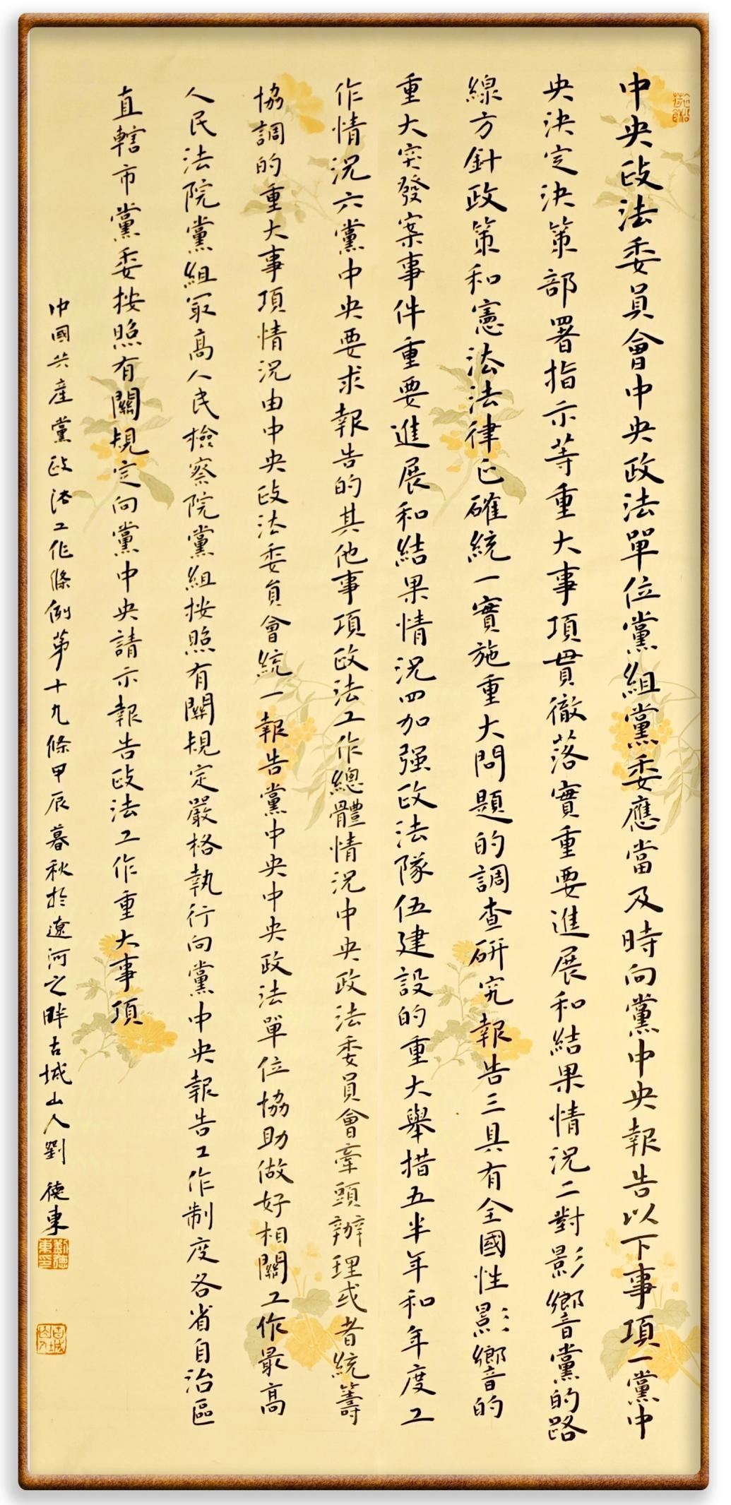 《中國共產(chǎn)黨政法工作條例》對黨領(lǐng)導(dǎo)新時(shí)代政法工作進(jìn)行全面制度擘畫,為黨領(lǐng)導(dǎo)政法工作提供基本遵循,具有重大而深遠(yuǎn)的意義。為學(xué)習(xí)好、宣傳好、貫徹好、實(shí)施好這部黨內(nèi)法規(guī),繼《中華人民共和國民法典》《中華人民共和國憲法》《信訪工作條例》《中華人民共和國澳門特別行政區(qū)基本法》《中華人民共和國香港特別行政區(qū)基本法》等法律法規(guī)之后,“書·法”系列活動(dòng)將筆端對準(zhǔn)《中國共產(chǎn)黨政法工作條例》。
