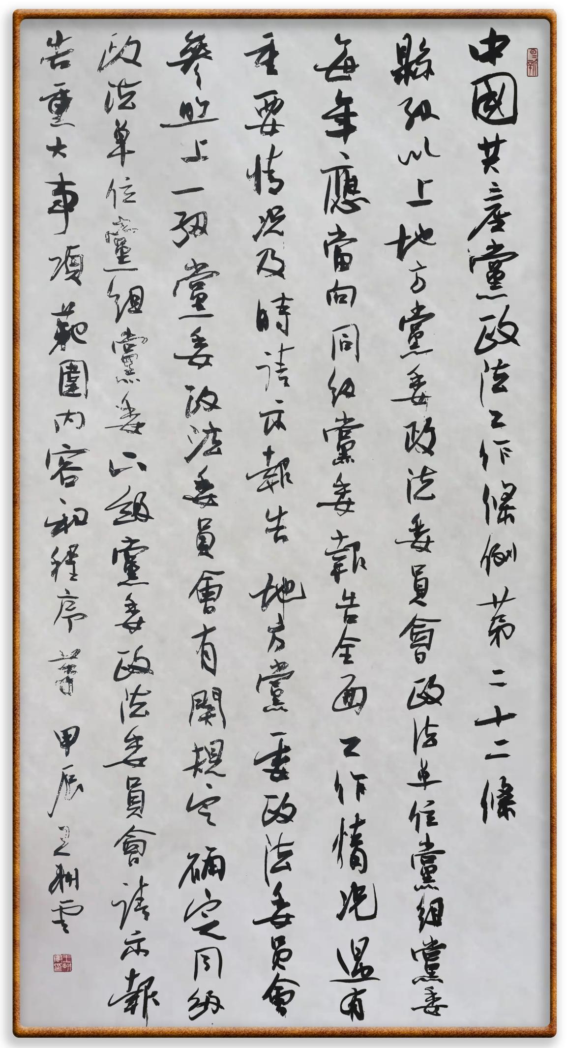 《中國共產(chǎn)黨政法工作條例》對(duì)黨領(lǐng)導(dǎo)新時(shí)代政法工作進(jìn)行全面制度擘畫,為黨領(lǐng)導(dǎo)政法工作提供基本遵循,具有重大而深遠(yuǎn)的意義。為學(xué)習(xí)好、宣傳好、貫徹好、實(shí)施好這部黨內(nèi)法規(guī),繼《中華人民共和國民法典》《中華人民共和國憲法》《信訪工作條例》《中華人民共和國澳門特別行政區(qū)基本法》《中華人民共和國香港特別行政區(qū)基本法》等法律法規(guī)之后,“書·法”系列活動(dòng)將筆端對(duì)準(zhǔn)《中國共產(chǎn)黨政法工作條例》。
