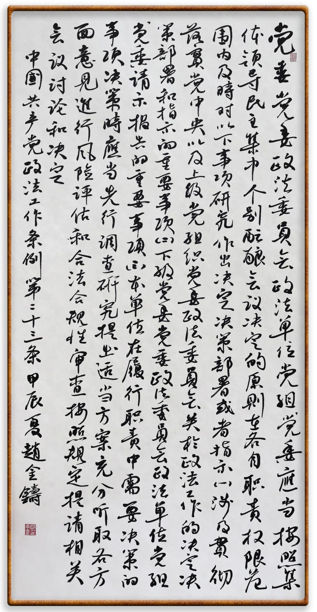 《中國共產(chǎn)黨政法工作條例》對黨領(lǐng)導(dǎo)新時代政法工作進(jìn)行全面制度擘畫,為黨領(lǐng)導(dǎo)政法工作提供基本遵循,具有重大而深遠(yuǎn)的意義。為學(xué)習(xí)好、宣傳好、貫徹好、實施好這部黨內(nèi)法規(guī),繼《中華人民共和國民法典》《中華人民共和國憲法》《信訪工作條例》《中華人民共和國澳門特別行政區(qū)基本法》《中華人民共和國香港特別行政區(qū)基本法》等法律法規(guī)之后,“書·法”系列活動將筆端對準(zhǔn)《中國共產(chǎn)黨政法工作條例》。