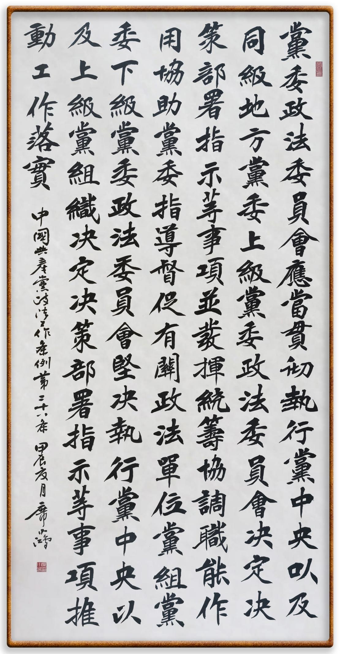 《中國共產(chǎn)黨政法工作條例》對黨領(lǐng)導(dǎo)新時代政法工作進行全面制度擘畫,為黨領(lǐng)導(dǎo)政法工作提供基本遵循,具有重大而深遠的意義。為學(xué)習(xí)好、宣傳好、貫徹好、實施好這部黨內(nèi)法規(guī),繼《中華人民共和國民法典》《中華人民共和國憲法》《信訪工作條例》《中華人民共和國澳門特別行政區(qū)基本法》《中華人民共和國香港特別行政區(qū)基本法》等法律法規(guī)之后,“書·法”系列活動將筆端對準《中國共產(chǎn)黨政法工作條例》。