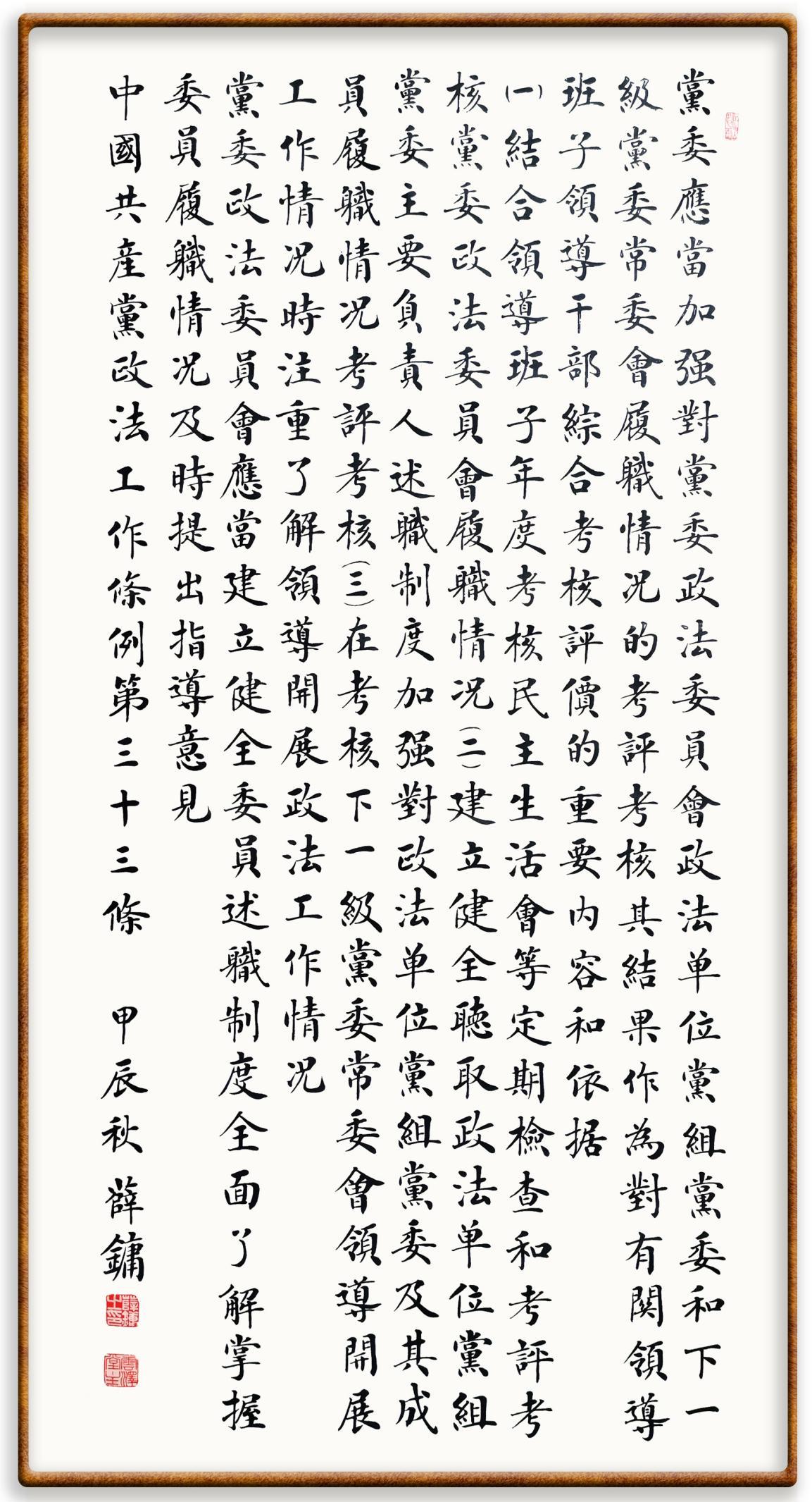 《中國共產(chǎn)黨政法工作條例》對黨領(lǐng)導(dǎo)新時代政法工作進(jìn)行全面制度擘畫,為黨領(lǐng)導(dǎo)政法工作提供基本遵循,具有重大而深遠(yuǎn)的意義。為學(xué)習(xí)好、宣傳好、貫徹好、實施好這部黨內(nèi)法規(guī),繼《中華人民共和國民法典》《中華人民共和國憲法》《信訪工作條例》《中華人民共和國澳門特別行政區(qū)基本法》《中華人民共和國香港特別行政區(qū)基本法》等法律法規(guī)之后,“書·法”系列活動將筆端對準(zhǔn)《中國共產(chǎn)黨政法工作條例》。