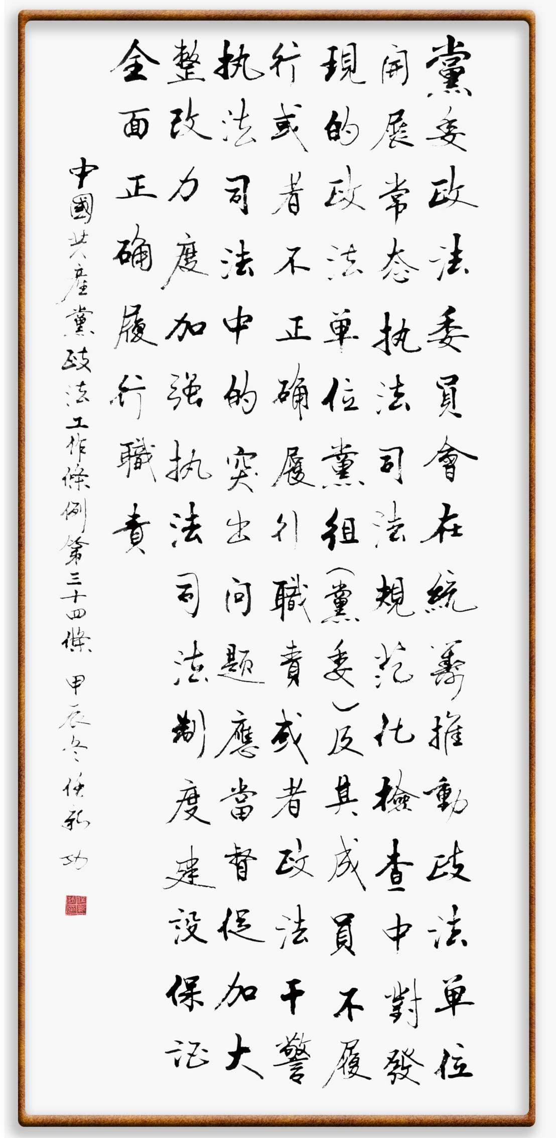《中國(guó)共產(chǎn)黨政法工作條例》對(duì)黨領(lǐng)導(dǎo)新時(shí)代政法工作進(jìn)行全面制度擘畫(huà),為黨領(lǐng)導(dǎo)政法工作提供基本遵循,具有重大而深遠(yuǎn)的意義。為學(xué)習(xí)好、宣傳好、貫徹好、實(shí)施好這部黨內(nèi)法規(guī),繼《中華人民共和國(guó)民法典》《中華人民共和國(guó)憲法》《信訪(fǎng)工作條例》《中華人民共和國(guó)澳門(mén)特別行政區(qū)基本法》《中華人民共和國(guó)香港特別行政區(qū)基本法》等法律法規(guī)之后,“書(shū)·法”系列活動(dòng)將筆端對(duì)準(zhǔn)《中國(guó)共產(chǎn)黨政法工作條例》。