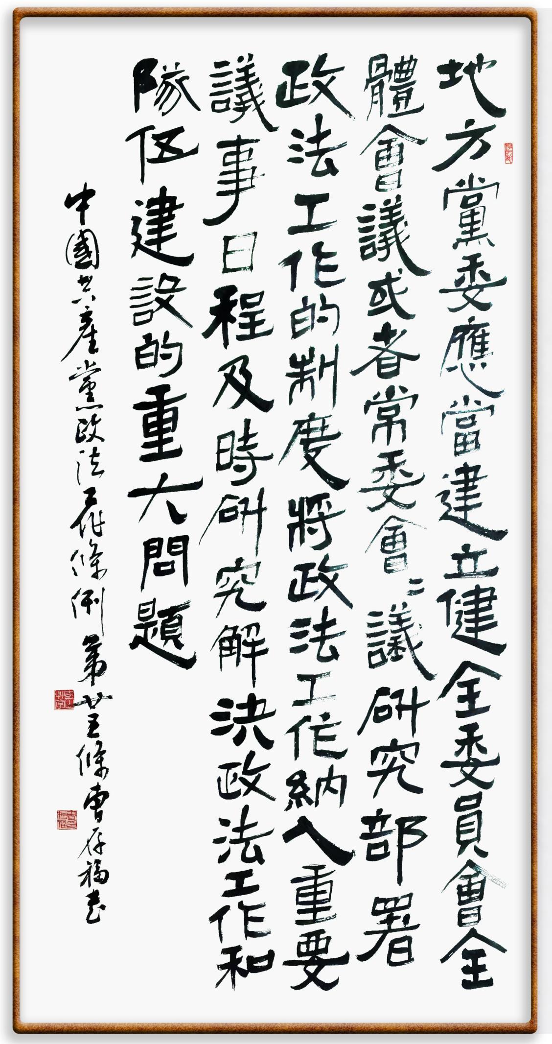 《中國共產(chǎn)黨政法工作條例》對黨領(lǐng)導新時代政法工作進行全面制度擘畫,為黨領(lǐng)導政法工作提供基本遵循,具有重大而深遠的意義。為學習好、宣傳好、貫徹好、實施好這部黨內(nèi)法規(guī),繼《中華人民共和國民法典》《中華人民共和國憲法》《信訪工作條例》《中華人民共和國澳門特別行政區(qū)基本法》《中華人民共和國香港特別行政區(qū)基本法》等法律法規(guī)之后,“書·法”系列活動將筆端對準《中國共產(chǎn)黨政法工作條例》。