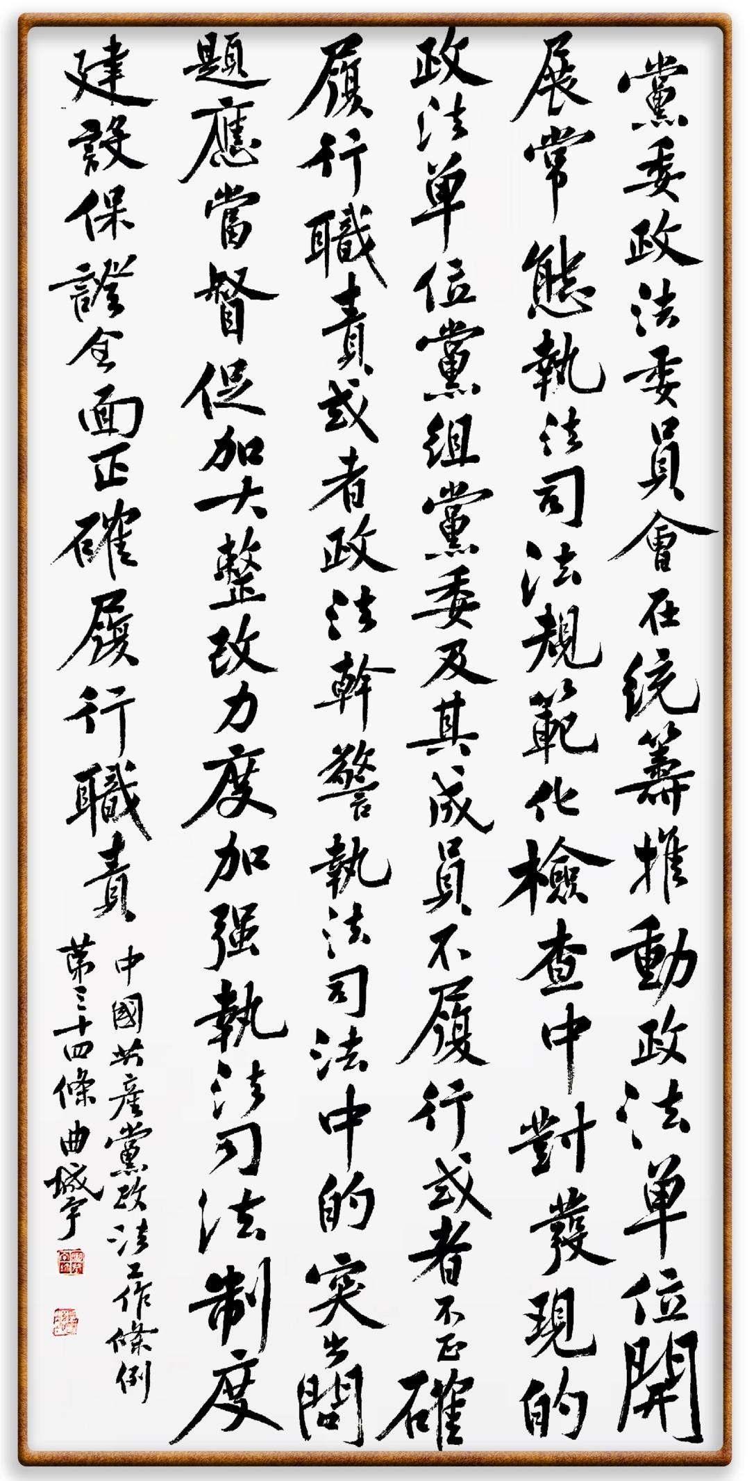 《中國共產(chǎn)黨政法工作條例》對黨領(lǐng)導新時代政法工作進行全面制度擘畫,為黨領(lǐng)導政法工作提供基本遵循,具有重大而深遠的意義。為學習好、宣傳好、貫徹好、實施好這部黨內(nèi)法規(guī),繼《中華人民共和國民法典》《中華人民共和國憲法》《信訪工作條例》《中華人民共和國澳門特別行政區(qū)基本法》《中華人民共和國香港特別行政區(qū)基本法》等法律法規(guī)之后,“書·法”系列活動將筆端對準《中國共產(chǎn)黨政法工作條例》。