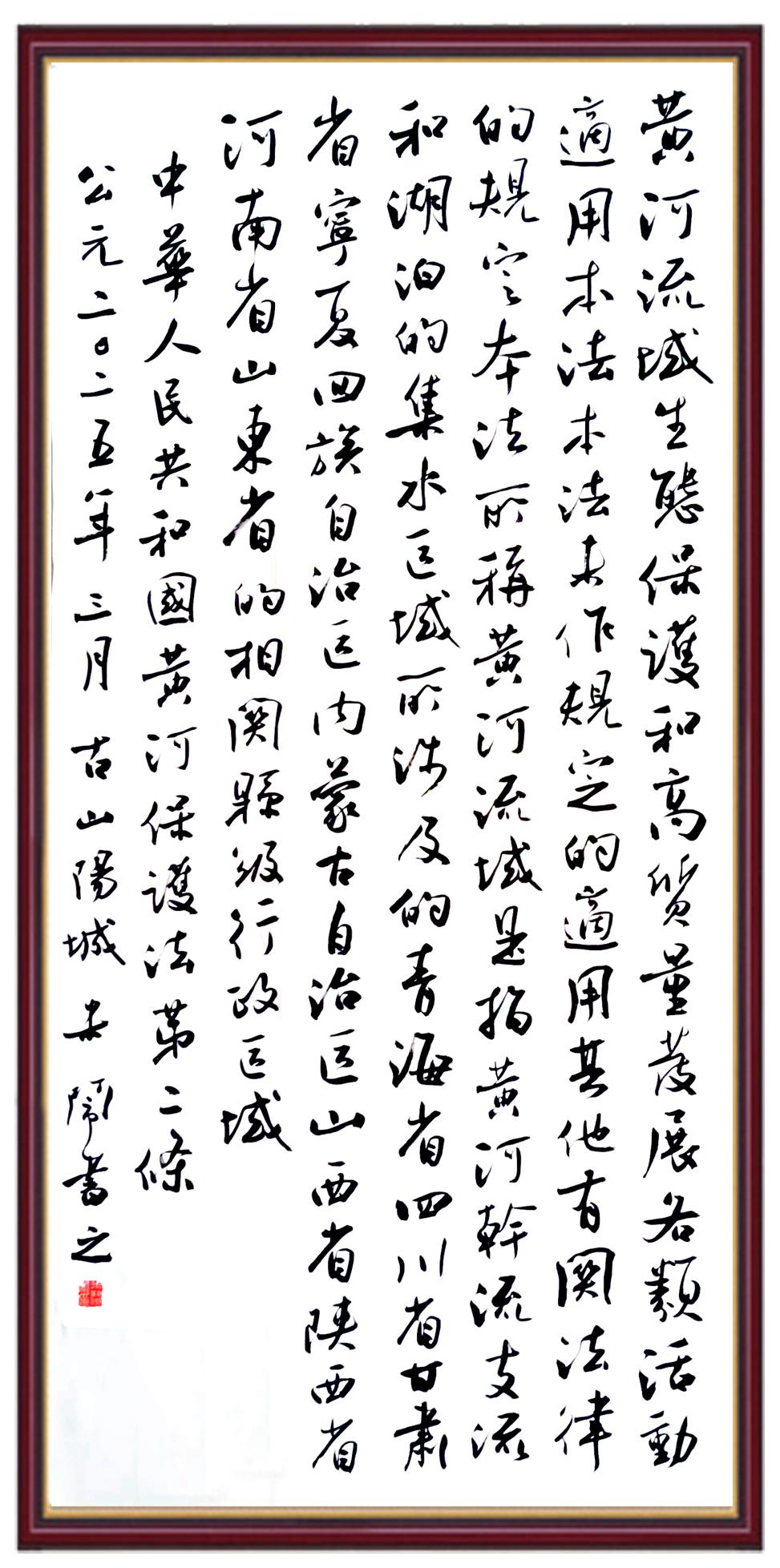 黃河寧,天下平。黃河是中華民族的發(fā)源地和搖籃,保護(hù)黃河是事關(guān)中華民族偉大復(fù)興的千秋大計?!吨腥A人民共和國黃河保護(hù)法》為推進(jìn)水資源節(jié)約集約利用、保護(hù)傳承弘揚黃河文化、推動黃河流域生態(tài)保護(hù)和高質(zhì)量發(fā)展提供了有力法治保障。繼書寫《中華人民共和國民法典》《中華人民共和國憲法》《中華人民共和國澳門特別行政區(qū)基本法》《中華人民共和國香港特別行政區(qū)基本法》《中華人民共和國國旗法》《中華人民共和國國徽法》《中華人民共和國國歌法》《中華人民共和國法官法》等法律法規(guī)之后,法制日報社聯(lián)合沿黃九?。▍^(qū))司法廳、書法家協(xié)會,將筆端對準(zhǔn)《中華人民共和國黃河保護(hù)法》。