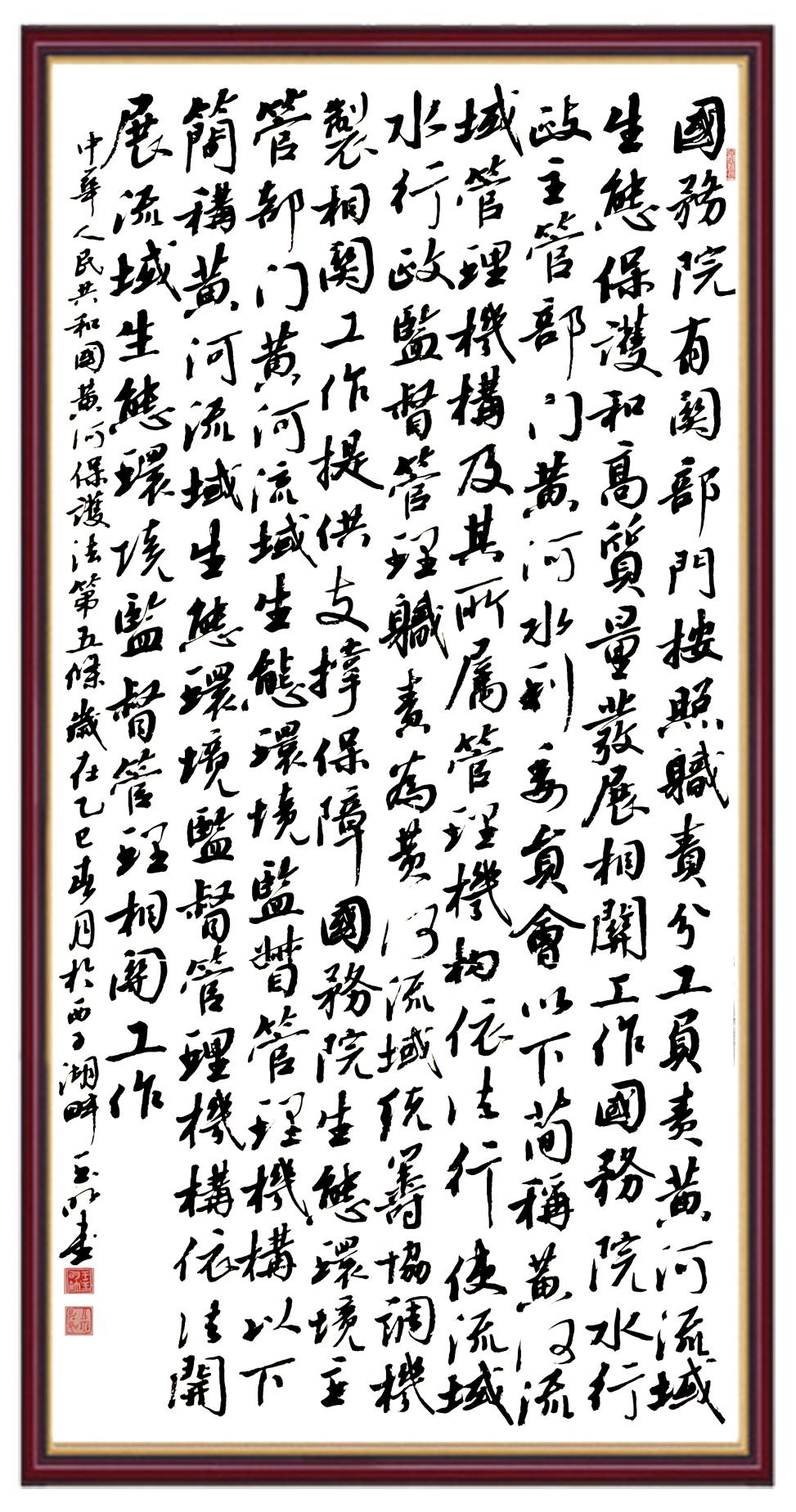 黃河寧,天下平。黃河是中華民族的發(fā)源地和搖籃,保護(hù)黃河是事關(guān)中華民族偉大復(fù)興的千秋大計(jì)?!吨腥A人民共和國黃河保護(hù)法》為推進(jìn)水資源節(jié)約集約利用、保護(hù)傳承弘揚(yáng)黃河文化、推動黃河流域生態(tài)保護(hù)和高質(zhì)量發(fā)展提供了有力法治保障。繼書寫《中華人民共和國民法典》《中華人民共和國憲法》《中華人民共和國澳門特別行政區(qū)基本法》《中華人民共和國香港特別行政區(qū)基本法》《中華人民共和國國旗法》《中華人民共和國國徽法》《中華人民共和國國歌法》《中華人民共和國法官法》等法律法規(guī)之后,法制日報(bào)社聯(lián)合沿黃九?。▍^(qū))司法廳、書法家協(xié)會,將筆端對準(zhǔn)《中華人民共和國黃河保護(hù)法》。