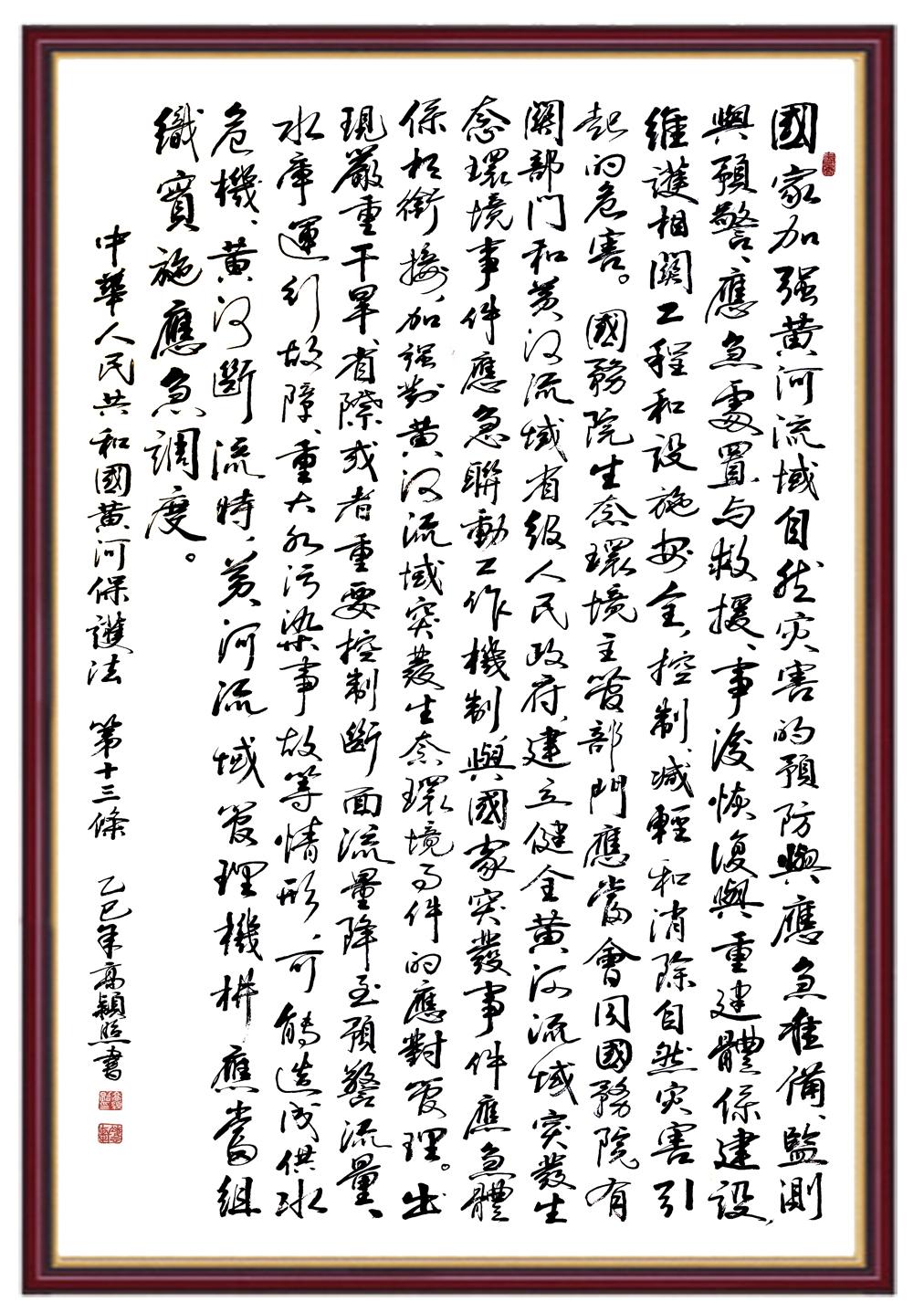 黃河寧,天下平。黃河是中華民族的發(fā)源地和搖籃,保護(hù)黃河是事關(guān)中華民族偉大復(fù)興的千秋大計(jì)?!吨腥A人民共和國黃河保護(hù)法》為推進(jìn)水資源節(jié)約集約利用、保護(hù)傳承弘揚(yáng)黃河文化、推動(dòng)黃河流域生態(tài)保護(hù)和高質(zhì)量發(fā)展提供了有力法治保障。繼書寫《中華人民共和國民法典》《中華人民共和國憲法》《中華人民共和國澳門特別行政區(qū)基本法》《中華人民共和國香港特別行政區(qū)基本法》《中華人民共和國國旗法》《中華人民共和國國徽法》《中華人民共和國國歌法》《中華人民共和國法官法》等法律法規(guī)之后,法制日報(bào)社聯(lián)合沿黃九省(區(qū))司法廳、書法家協(xié)會(huì),將筆端對準(zhǔn)《中華人民共和國黃河保護(hù)法》。