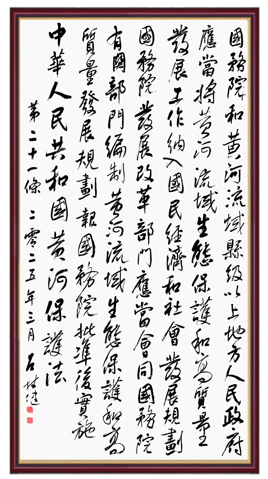 黃河寧,天下平。黃河是中華民族的發(fā)源地和搖籃,保護(hù)黃河是事關(guān)中華民族偉大復(fù)興的千秋大計(jì)。《中華人民共和國(guó)黃河保護(hù)法》為推進(jìn)水資源節(jié)約集約利用、保護(hù)傳承弘揚(yáng)黃河文化、推動(dòng)黃河流域生態(tài)保護(hù)和高質(zhì)量發(fā)展提供了有力法治保障。繼書寫《中華人民共和國(guó)民法典》《中華人民共和國(guó)憲法》《中華人民共和國(guó)澳門特別行政區(qū)基本法》《中華人民共和國(guó)香港特別行政區(qū)基本法》《中華人民共和國(guó)國(guó)旗法》《中華人民共和國(guó)國(guó)徽法》《中華人民共和國(guó)國(guó)歌法》《中華人民共和國(guó)法官法》等法律法規(guī)之后,法制日?qǐng)?bào)社聯(lián)合沿黃九省(區(qū))司法廳、書法家協(xié)會(huì),將筆端對(duì)準(zhǔn)《中華人民共和國(guó)黃河保護(hù)法》。