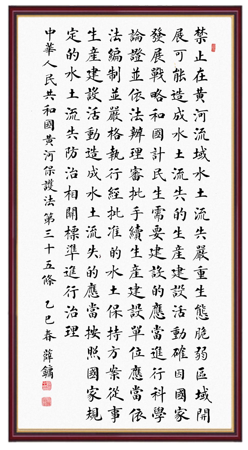 黃河寧,天下平。黃河是中華民族的發(fā)源地和搖籃,保護黃河是事關中華民族偉大復興的千秋大計?!吨腥A人民共和國黃河保護法》為推進水資源節(jié)約集約利用、保護傳承弘揚黃河文化、推動黃河流域生態(tài)保護和高質量發(fā)展提供了有力法治保障。繼書寫《中華人民共和國民法典》《中華人民共和國憲法》《中華人民共和國澳門特別行政區(qū)基本法》《中華人民共和國香港特別行政區(qū)基本法》《中華人民共和國國旗法》《中華人民共和國國徽法》《中華人民共和國國歌法》《中華人民共和國法官法》等法律法規(guī)之后,法制日報社聯合沿黃九?。▍^(qū))司法廳、書法家協(xié)會,將筆端對準《中華人民共和國黃河保護法》。
