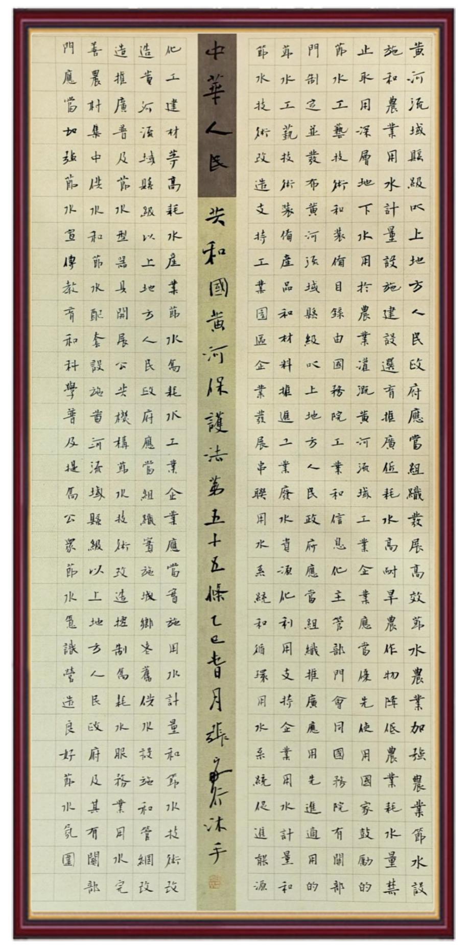 黃河寧,天下平。黃河是中華民族的發(fā)源地和搖籃,保護(hù)黃河是事關(guān)中華民族偉大復(fù)興的千秋大計(jì)?!吨腥A人民共和國黃河保護(hù)法》為推進(jìn)水資源節(jié)約集約利用、保護(hù)傳承弘揚(yáng)黃河文化、推動(dòng)黃河流域生態(tài)保護(hù)和高質(zhì)量發(fā)展提供了有力法治保障。繼書寫《中華人民共和國民法典》《中華人民共和國憲法》《中華人民共和國澳門特別行政區(qū)基本法》《中華人民共和國香港特別行政區(qū)基本法》《中華人民共和國國旗法》《中華人民共和國國徽法》《中華人民共和國國歌法》《中華人民共和國法官法》等法律法規(guī)之后,法制日報(bào)社聯(lián)合沿黃九?。▍^(qū))司法廳、書法家協(xié)會,將筆端對準(zhǔn)《中華人民共和國黃河保護(hù)法》。