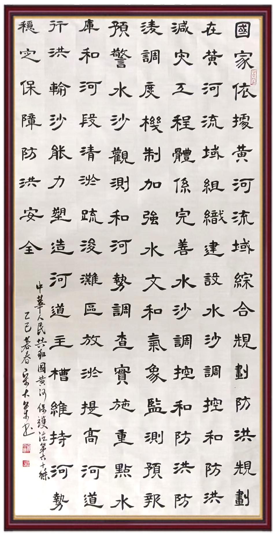 黃河寧,天下平。黃河是中華民族的發(fā)源地和搖籃,保護(hù)黃河是事關(guān)中華民族偉大復(fù)興的千秋大計(jì)?!吨腥A人民共和國(guó)黃河保護(hù)法》為推進(jìn)水資源節(jié)約集約利用、保護(hù)傳承弘揚(yáng)黃河文化、推動(dòng)黃河流域生態(tài)保護(hù)和高質(zhì)量發(fā)展提供了有力法治保障。繼書寫《中華人民共和國(guó)民法典》《中華人民共和國(guó)憲法》《中華人民共和國(guó)澳門特別行政區(qū)基本法》《中華人民共和國(guó)香港特別行政區(qū)基本法》《中華人民共和國(guó)國(guó)旗法》《中華人民共和國(guó)國(guó)徽法》《中華人民共和國(guó)國(guó)歌法》《中華人民共和國(guó)法官法》等法律法規(guī)之后,法制日?qǐng)?bào)社聯(lián)合沿黃九?。▍^(qū))司法廳、書法家協(xié)會(huì),將筆端對(duì)準(zhǔn)《中華人民共和國(guó)黃河保護(hù)法》。