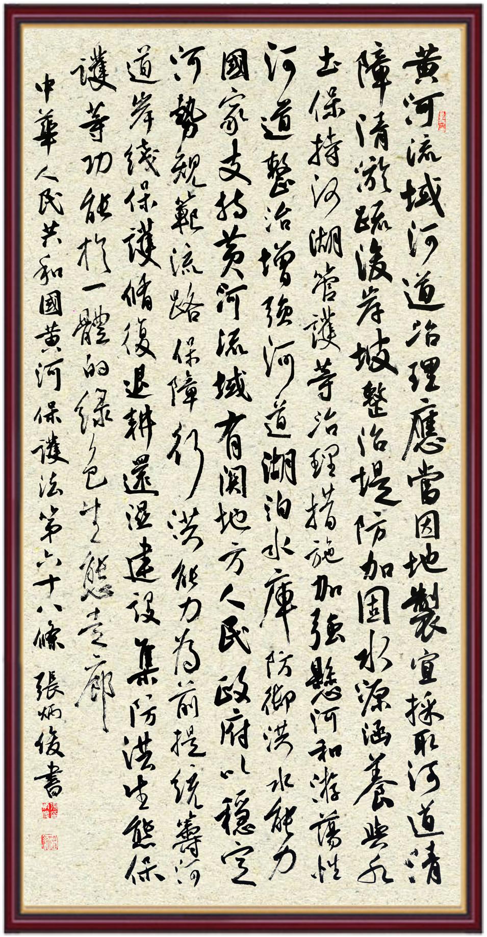 黃河寧,天下平。黃河是中華民族的發(fā)源地和搖籃,保護(hù)黃河是事關(guān)中華民族偉大復(fù)興的千秋大計(jì)。《中華人民共和國(guó)黃河保護(hù)法》為推進(jìn)水資源節(jié)約集約利用、保護(hù)傳承弘揚(yáng)黃河文化、推動(dòng)黃河流域生態(tài)保護(hù)和高質(zhì)量發(fā)展提供了有力法治保障。繼書(shū)寫(xiě)《中華人民共和國(guó)民法典》《中華人民共和國(guó)憲法》《中華人民共和國(guó)澳門(mén)特別行政區(qū)基本法》《中華人民共和國(guó)香港特別行政區(qū)基本法》《中華人民共和國(guó)國(guó)旗法》《中華人民共和國(guó)國(guó)徽法》《中華人民共和國(guó)國(guó)歌法》《中華人民共和國(guó)法官法》等法律法規(guī)之后,法制日?qǐng)?bào)社聯(lián)合沿黃九?。▍^(qū))司法廳、書(shū)法家協(xié)會(huì),將筆端對(duì)準(zhǔn)《中華人民共和國(guó)黃河保護(hù)法》。