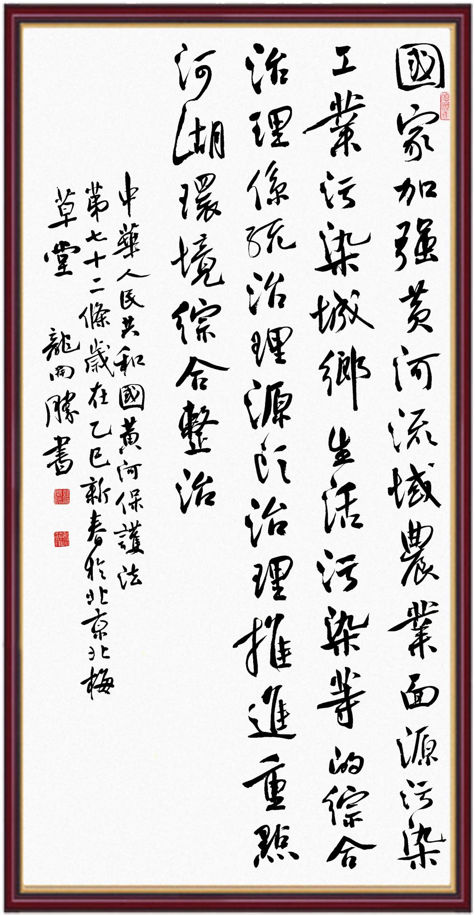 黃河寧,天下平。黃河是中華民族的發(fā)源地和搖籃,保護黃河是事關中華民族偉大復興的千秋大計。《中華人民共和國黃河保護法》為推進水資源節(jié)約集約利用、保護傳承弘揚黃河文化、推動黃河流域生態(tài)保護和高質量發(fā)展提供了有力法治保障。繼書寫《中華人民共和國民法典》《中華人民共和國憲法》《中華人民共和國澳門特別行政區(qū)基本法》《中華人民共和國香港特別行政區(qū)基本法》《中華人民共和國國旗法》《中華人民共和國國徽法》《中華人民共和國國歌法》《中華人民共和國法官法》等法律法規(guī)之后,法制日報社聯(lián)合沿黃九?。▍^(qū))司法廳、書法家協(xié)會,將筆端對準《中華人民共和國黃河保護法》。