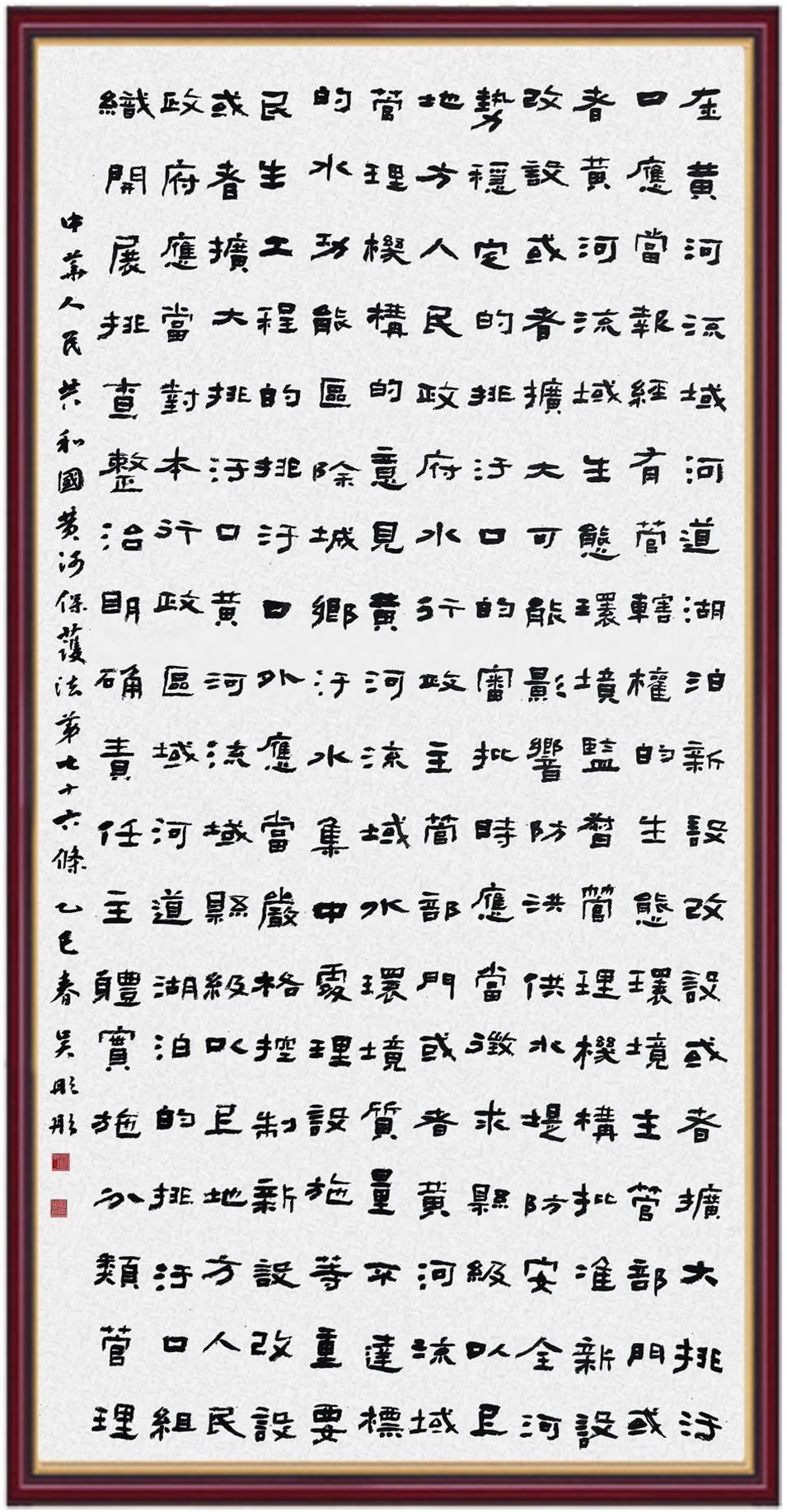 黃河寧,天下平。黃河是中華民族的發(fā)源地和搖籃,保護黃河是事關中華民族偉大復興的千秋大計?!吨腥A人民共和國黃河保護法》為推進水資源節(jié)約集約利用、保護傳承弘揚黃河文化、推動黃河流域生態(tài)保護和高質(zhì)量發(fā)展提供了有力法治保障。繼書寫《中華人民共和國民法典》《中華人民共和國憲法》《中華人民共和國澳門特別行政區(qū)基本法》《中華人民共和國香港特別行政區(qū)基本法》《中華人民共和國國旗法》《中華人民共和國國徽法》《中華人民共和國國歌法》《中華人民共和國法官法》等法律法規(guī)之后,法制日報社聯(lián)合沿黃九省(區(qū))司法廳、書法家協(xié)會,將筆端對準《中華人民共和國黃河保護法》。