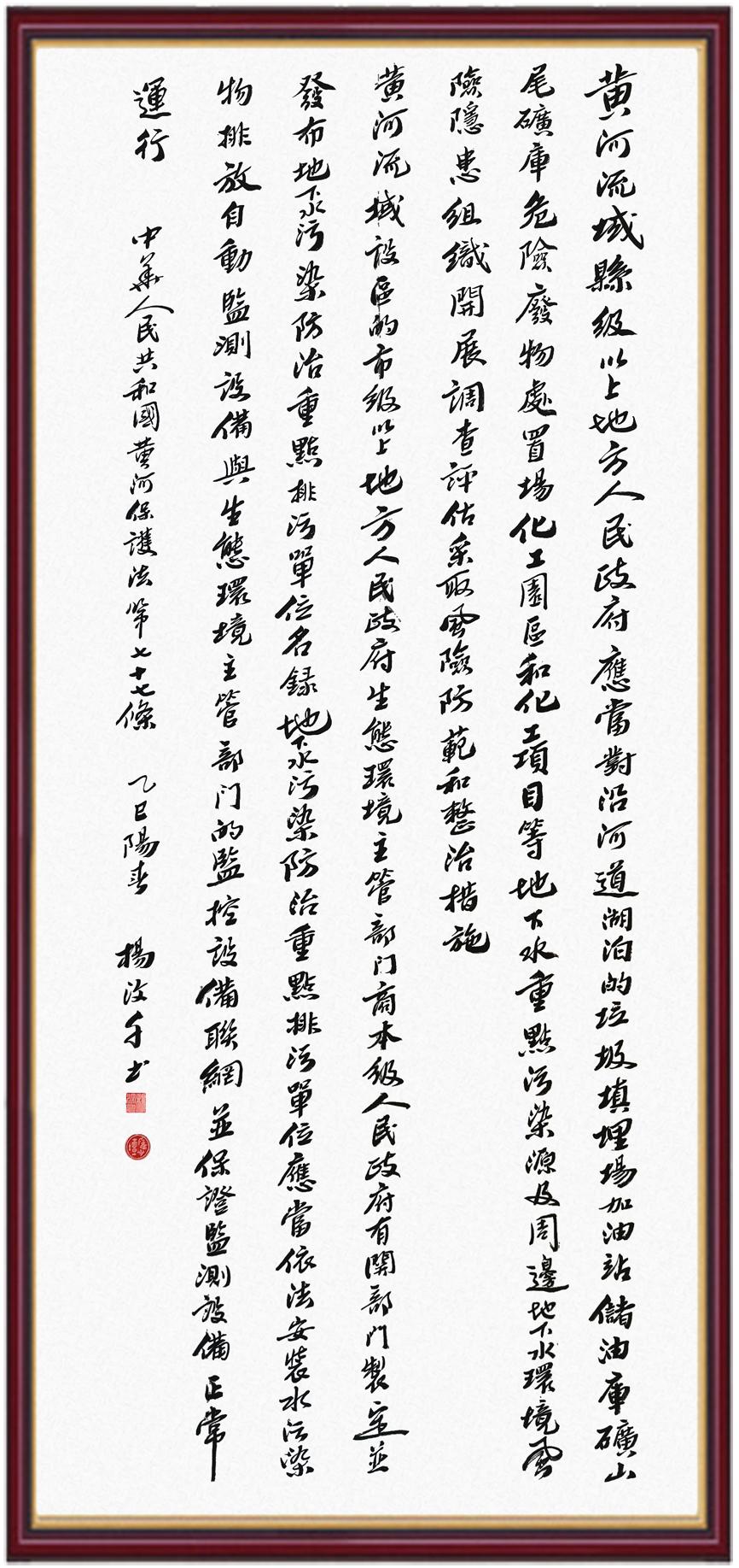 黃河寧,天下平。黃河是中華民族的發(fā)源地和搖籃,保護黃河是事關中華民族偉大復興的千秋大計。《中華人民共和國黃河保護法》為推進水資源節(jié)約集約利用、保護傳承弘揚黃河文化、推動黃河流域生態(tài)保護和高質(zhì)量發(fā)展提供了有力法治保障。繼書寫《中華人民共和國民法典》《中華人民共和國憲法》《中華人民共和國澳門特別行政區(qū)基本法》《中華人民共和國香港特別行政區(qū)基本法》《中華人民共和國國旗法》《中華人民共和國國徽法》《中華人民共和國國歌法》《中華人民共和國法官法》等法律法規(guī)之后,法制日報社聯(lián)合沿黃九?。▍^(qū))司法廳、書法家協(xié)會,將筆端對準《中華人民共和國黃河保護法》。