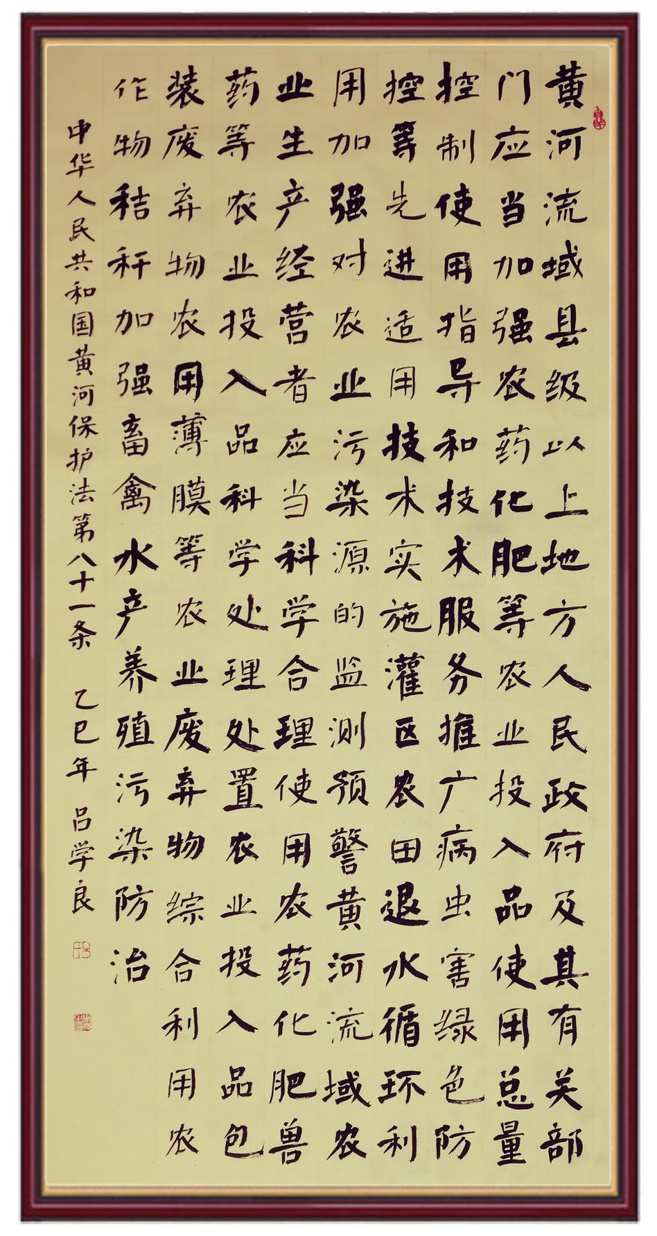 黃河寧,天下平。黃河是中華民族的發(fā)源地和搖籃,保護(hù)黃河是事關(guān)中華民族偉大復(fù)興的千秋大計(jì)。《中華人民共和國(guó)黃河保護(hù)法》為推進(jìn)水資源節(jié)約集約利用、保護(hù)傳承弘揚(yáng)黃河文化、推動(dòng)黃河流域生態(tài)保護(hù)和高質(zhì)量發(fā)展提供了有力法治保障。繼書寫《中華人民共和國(guó)民法典》《中華人民共和國(guó)憲法》《中華人民共和國(guó)澳門特別行政區(qū)基本法》《中華人民共和國(guó)香港特別行政區(qū)基本法》《中華人民共和國(guó)國(guó)旗法》《中華人民共和國(guó)國(guó)徽法》《中華人民共和國(guó)國(guó)歌法》《中華人民共和國(guó)法官法》等法律法規(guī)之后,法制日?qǐng)?bào)社聯(lián)合沿黃九?。▍^(qū))司法廳、書法家協(xié)會(huì),將筆端對(duì)準(zhǔn)《中華人民共和國(guó)黃河保護(hù)法》。