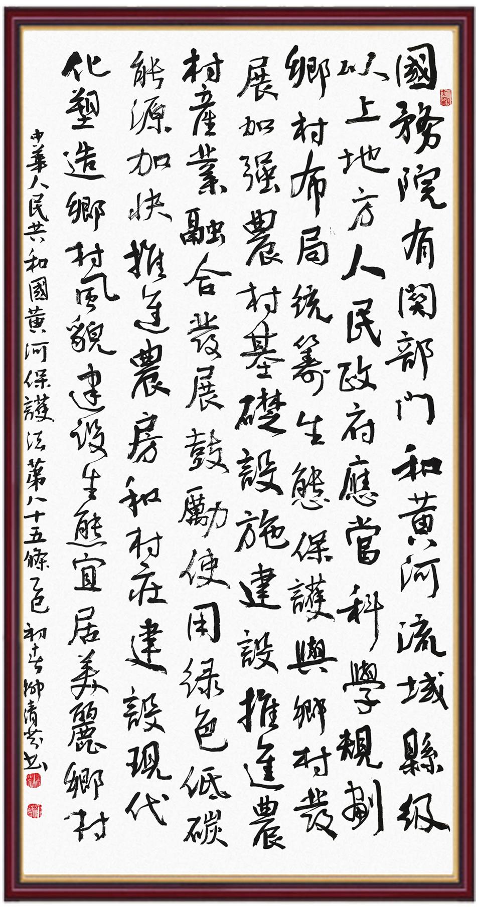 黃河寧,天下平。黃河是中華民族的發(fā)源地和搖籃,保護(hù)黃河是事關(guān)中華民族偉大復(fù)興的千秋大計(jì)?!吨腥A人民共和國黃河保護(hù)法》為推進(jìn)水資源節(jié)約集約利用、保護(hù)傳承弘揚(yáng)黃河文化、推動(dòng)黃河流域生態(tài)保護(hù)和高質(zhì)量發(fā)展提供了有力法治保障。繼書寫《中華人民共和國民法典》《中華人民共和國憲法》《中華人民共和國澳門特別行政區(qū)基本法》《中華人民共和國香港特別行政區(qū)基本法》《中華人民共和國國旗法》《中華人民共和國國徽法》《中華人民共和國國歌法》《中華人民共和國法官法》等法律法規(guī)之后,法制日報(bào)社聯(lián)合沿黃九?。▍^(qū))司法廳、書法家協(xié)會(huì),將筆端對準(zhǔn)《中華人民共和國黃河保護(hù)法》。