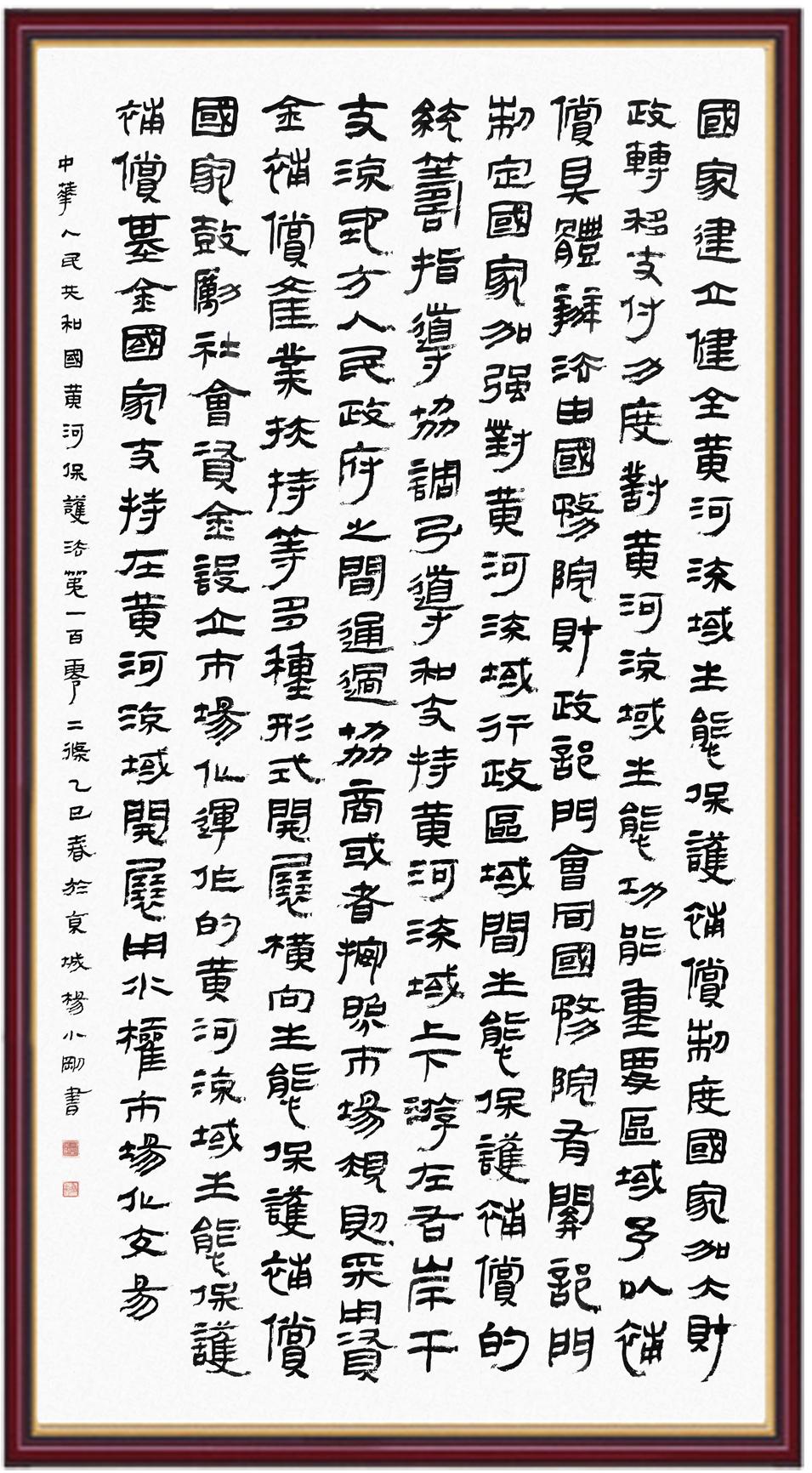 黃河寧,天下平。黃河是中華民族的發(fā)源地和搖籃,保護(hù)黃河是事關(guān)中華民族偉大復(fù)興的千秋大計(jì)。《中華人民共和國黃河保護(hù)法》為推進(jìn)水資源節(jié)約集約利用、保護(hù)傳承弘揚(yáng)黃河文化、推動(dòng)黃河流域生態(tài)保護(hù)和高質(zhì)量發(fā)展提供了有力法治保障。繼書寫《中華人民共和國民法典》《中華人民共和國憲法》《中華人民共和國澳門特別行政區(qū)基本法》《中華人民共和國香港特別行政區(qū)基本法》《中華人民共和國國旗法》《中華人民共和國國徽法》《中華人民共和國國歌法》《中華人民共和國法官法》等法律法規(guī)之后,法制日報(bào)社聯(lián)合沿黃九?。▍^(qū))司法廳、書法家協(xié)會(huì),將筆端對準(zhǔn)《中華人民共和國黃河保護(hù)法》。