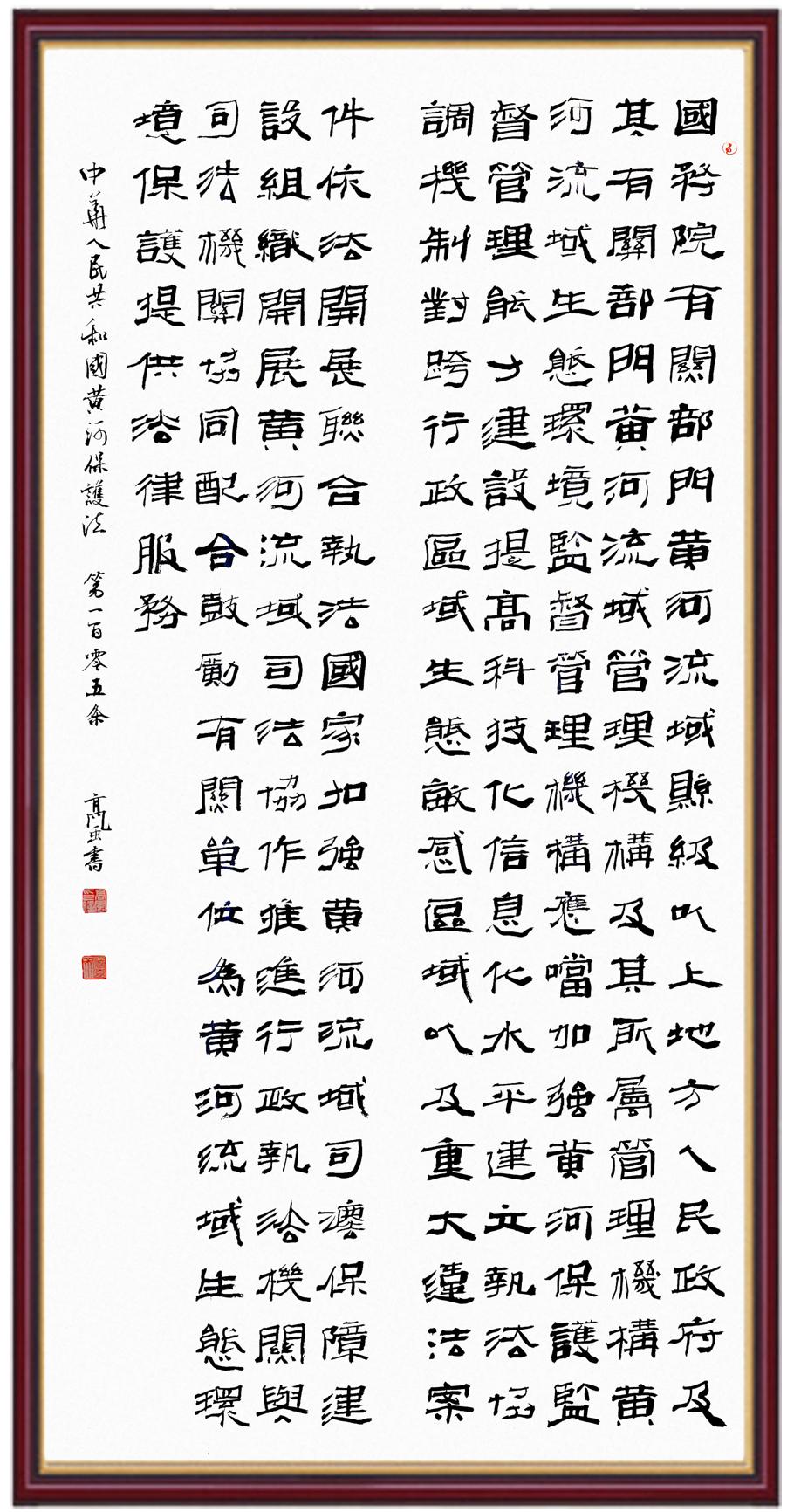 黃河寧,天下平。黃河是中華民族的發(fā)源地和搖籃,保護(hù)黃河是事關(guān)中華民族偉大復(fù)興的千秋大計。《中華人民共和國黃河保護(hù)法》為推進(jìn)水資源節(jié)約集約利用、保護(hù)傳承弘揚(yáng)黃河文化、推動黃河流域生態(tài)保護(hù)和高質(zhì)量發(fā)展提供了有力法治保障。繼書寫《中華人民共和國民法典》《中華人民共和國憲法》《中華人民共和國澳門特別行政區(qū)基本法》《中華人民共和國香港特別行政區(qū)基本法》《中華人民共和國國旗法》《中華人民共和國國徽法》《中華人民共和國國歌法》《中華人民共和國法官法》等法律法規(guī)之后,法制日報社聯(lián)合沿黃九?。▍^(qū))司法廳、書法家協(xié)會,將筆端對準(zhǔn)《中華人民共和國黃河保護(hù)法》。