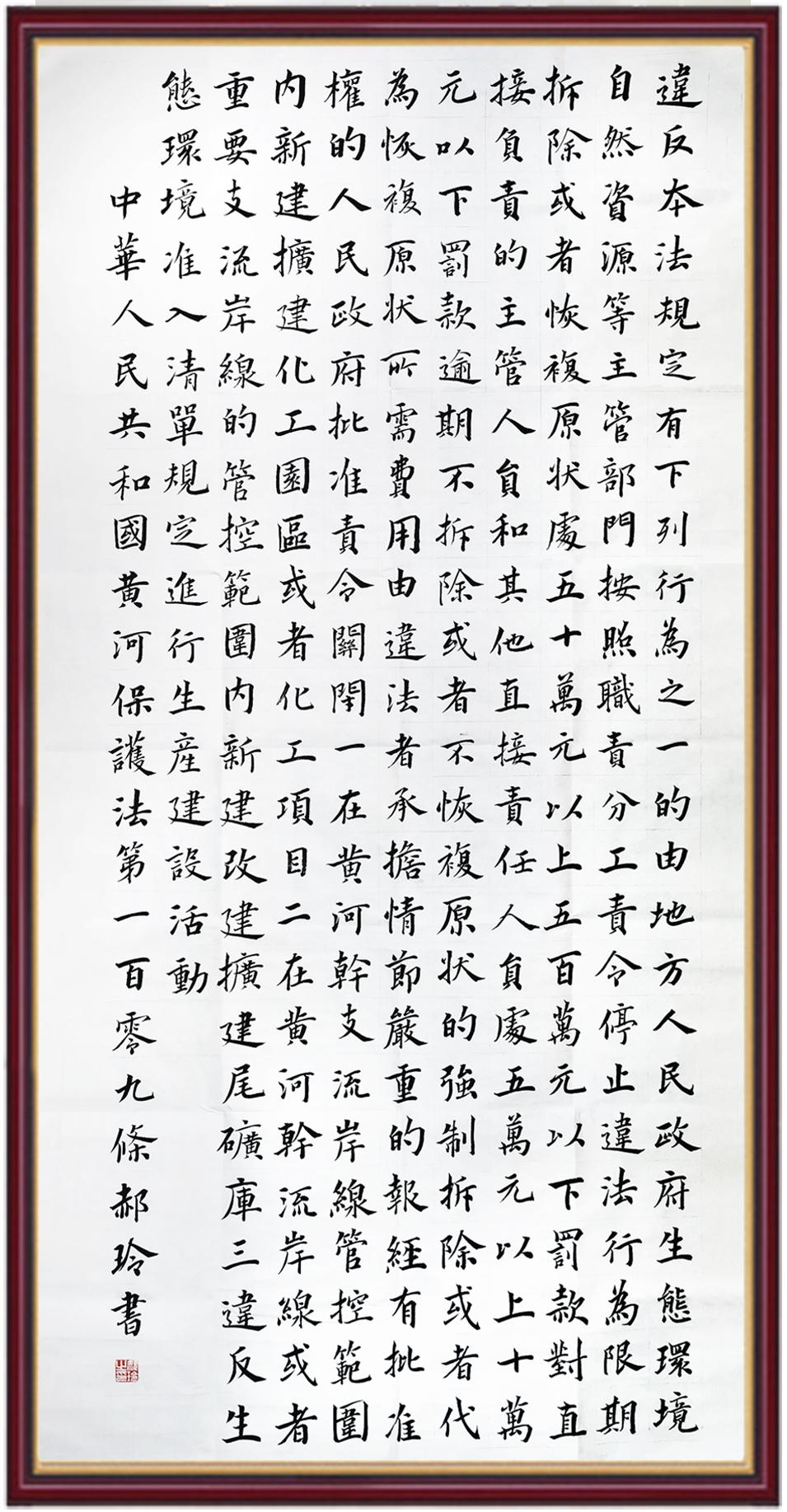 黃河寧,天下平。黃河是中華民族的發(fā)源地和搖籃,保護(hù)黃河是事關(guān)中華民族偉大復(fù)興的千秋大計(jì)?!吨腥A人民共和國(guó)黃河保護(hù)法》為推進(jìn)水資源節(jié)約集約利用、保護(hù)傳承弘揚(yáng)黃河文化、推動(dòng)黃河流域生態(tài)保護(hù)和高質(zhì)量發(fā)展提供了有力法治保障。繼書(shū)寫(xiě)《中華人民共和國(guó)民法典》《中華人民共和國(guó)憲法》《中華人民共和國(guó)澳門(mén)特別行政區(qū)基本法》《中華人民共和國(guó)香港特別行政區(qū)基本法》《中華人民共和國(guó)國(guó)旗法》《中華人民共和國(guó)國(guó)徽法》《中華人民共和國(guó)國(guó)歌法》《中華人民共和國(guó)法官法》等法律法規(guī)之后,法制日?qǐng)?bào)社聯(lián)合沿黃九?。▍^(qū))司法廳、書(shū)法家協(xié)會(huì),將筆端對(duì)準(zhǔn)《中華人民共和國(guó)黃河保護(hù)法》。
