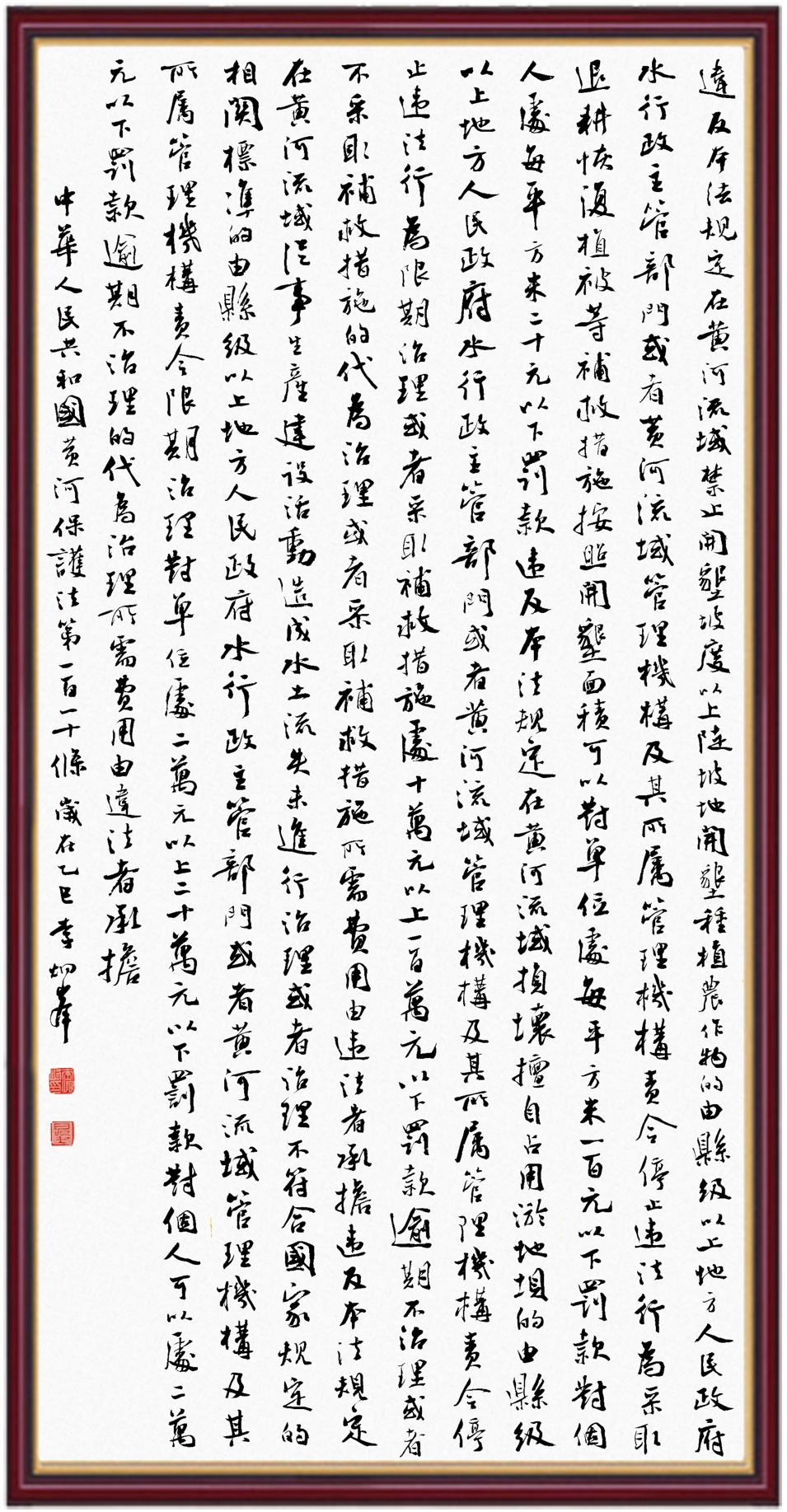 黃河寧,天下平。黃河是中華民族的發(fā)源地和搖籃,保護黃河是事關(guān)中華民族偉大復(fù)興的千秋大計?!吨腥A人民共和國黃河保護法》為推進水資源節(jié)約集約利用、保護傳承弘揚黃河文化、推動黃河流域生態(tài)保護和高質(zhì)量發(fā)展提供了有力法治保障。繼書寫《中華人民共和國民法典》《中華人民共和國憲法》《中華人民共和國澳門特別行政區(qū)基本法》《中華人民共和國香港特別行政區(qū)基本法》《中華人民共和國國旗法》《中華人民共和國國徽法》《中華人民共和國國歌法》《中華人民共和國法官法》等法律法規(guī)之后,法制日報社聯(lián)合沿黃九?。▍^(qū))司法廳、書法家協(xié)會,將筆端對準《中華人民共和國黃河保護法》。